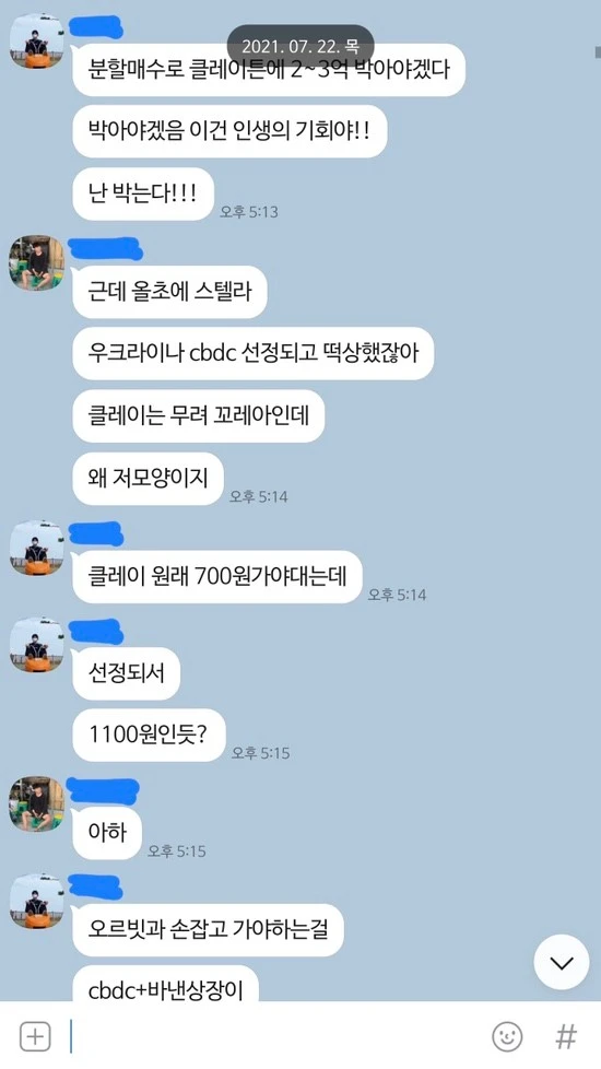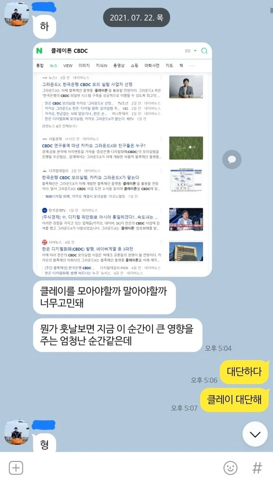 내용인 즉슨, 카카오 그룹이 만든 암호화폐 클레이튼 (코인원과 빗썸에 상장되어 있음)이 한국은행의 CBDC (중앙은행 디지털화폐 발행) 사업에 참여한다는 것이었다. EOH는 지금 이 순간이 미래에 큰 영향을 주는 순간 같다며 3억원 정도의 현금을 클레이튼에 박겠다는 이야기를 했다.