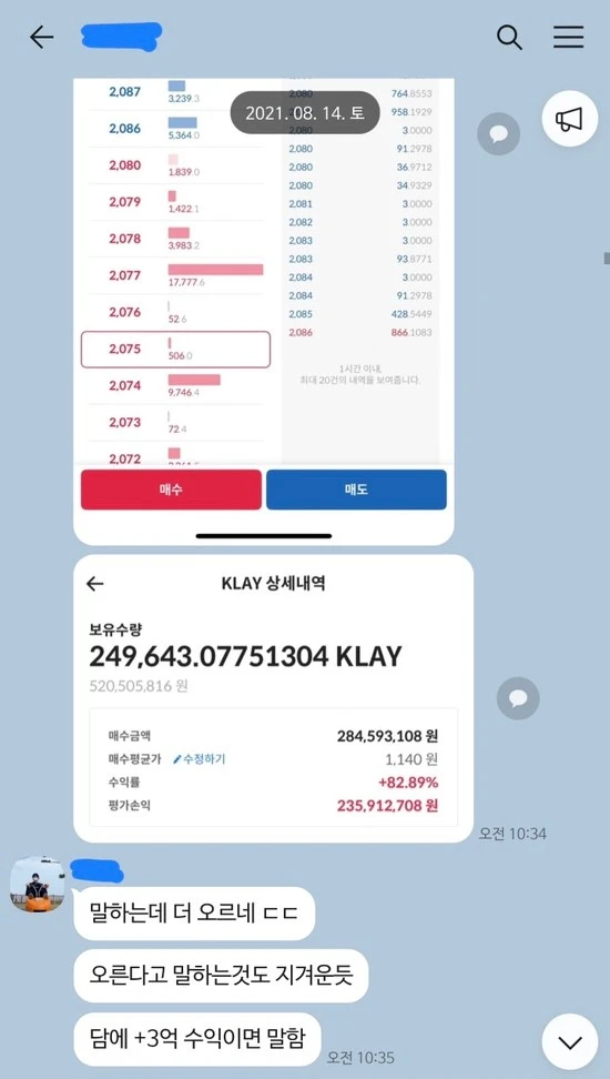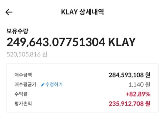 그리고 8월 14일, 3주가 지난 시점에서 1140원이던 클레이튼 가격은 2080원으로 근 2배가 올랐다. (심지어 글을 쓰는 지금은 더 올랐다.) 이 기간 동안 EOH가 번 수익은 235,912,708원. 남들 10년 일해서 모을 돈을 한 달도 안되는 기간에 벌어들였다.
