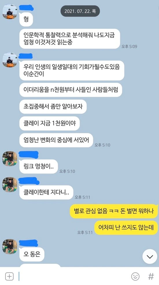 당시 이 이야기를 듣던 나는 “군대를 다녀오니 돈에 대한 관심이 사라졌다. 돈 벌면 뭐하냐 어차피 군대에서 쓰지도 못하는거. 내가 얼마가 있던 전역은 살 수 없고 자유는 구속되어 있었다.” 라는 말을 하며 EOH가 밥 떠먹여서 숟가락을 입 앞에 가져다댔는데도 클레이튼을 하나도 사지 않았다.