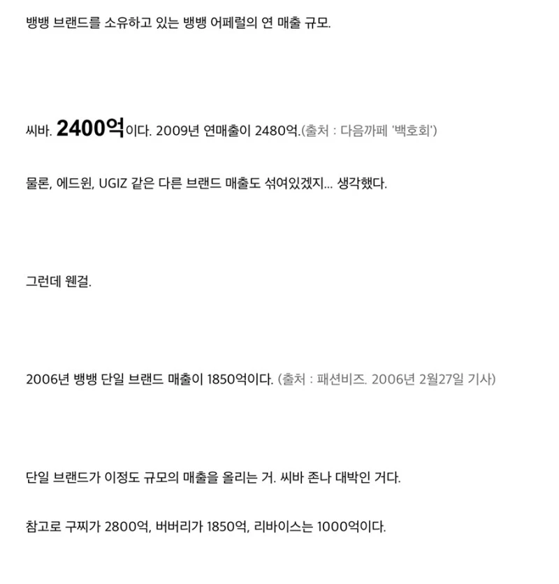 딴지일보 기사에 따르면, 뱅뱅어페럴의 평균 매출 규모는 2400억이며 (찾아보니 코로나 때문에 최근에는 좀 줄었다고 하나 여전히 1000억이 넘는 매출을 내고 있음.) 당시 리바이스 매출 규모는 1000억이었다. 다시 말해 압도적으로 뱅뱅의 매출이 높았다.