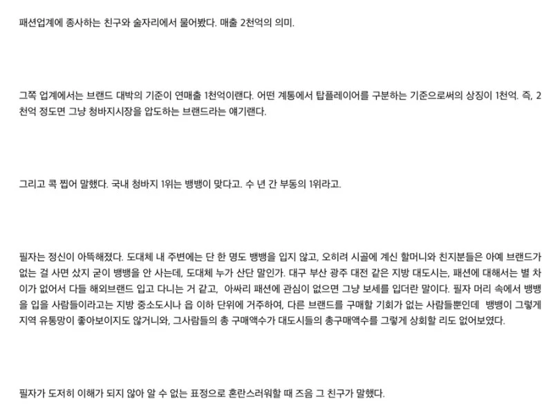 나는 통계 자료를 보기 전만 해도 내가 입고, 친구들도 입는 리바이스나 유니클로 같은 회사라고 생각했다. 아니다. 명실상부 대한민국에서 최고의 청바지 매출 판매를 내는 회사는 바로 ‘뱅뱅’이다.
