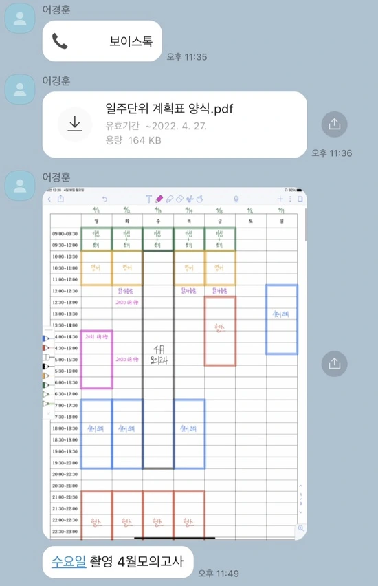 A. 내가 보내준 일주일 단위 계획표 PDF 파일 양식 있지? 그거를 활용하면 되는데, 아이패드 노타빌리티 앱을 써서 애플펜슬로 나는 작성을 해. 시간은 매주 일요일 밤 저녁.