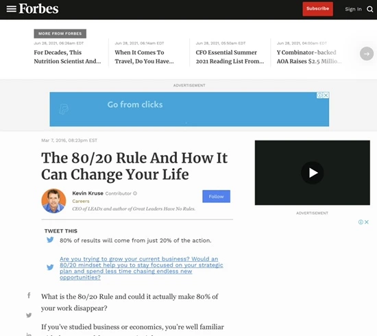 기사의 내용은 이렇다. 파레토의 법칙이라는 것이 있다. 이탈리아의 경제학자 파레토라는 사람이 사회의 소득불평등을 조사해보니 상위 20%의 사람들이 부의 80%를 거머쥐고 있었다는 이론이다. 그런데 최근 연구에 의하면 사람의 성취도 이와 유사하단다. 상위 20%의 행동이 인생 성취 80%를 담당한다. 하지만 우리는 왜 이 점을 인식하며 살고 있지 않은가? 이걸 인식하는 것만으로도 인생의 큰 부분이 바뀔 것이다. 라는게 대략적인 요지다.