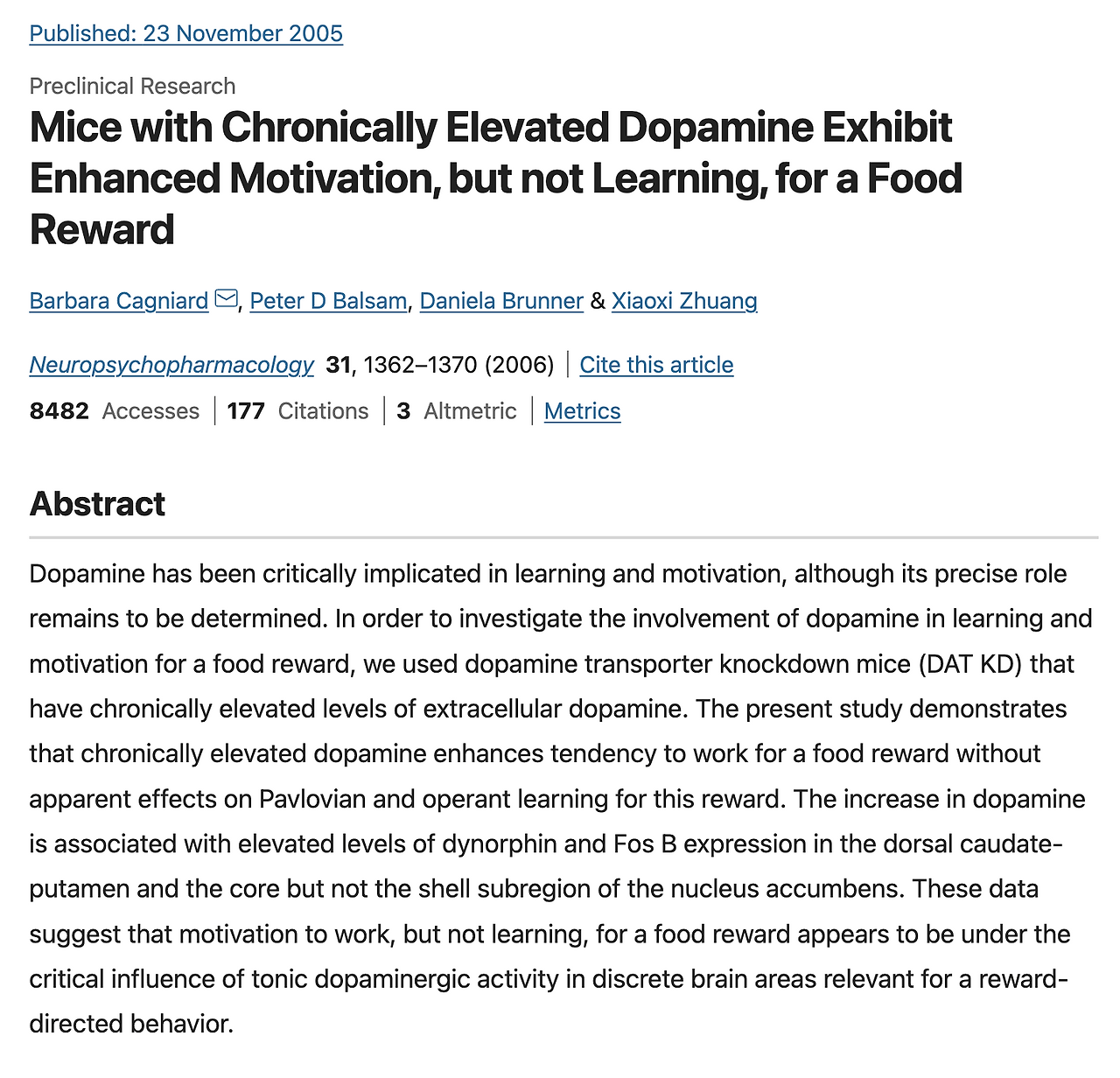 도파민이 실제 먹이를 먹을 때 나오는 '현재지향적 호르몬'이 아니라, 미래의 좋은 결과를 기대 할 때 나오는 '기대감 호르몬'이라는 것을 증명하기 위해 쥐를 가지고 실험을 했다. 과학자들은 쥐의 모든 도파민 뉴런 하나하나에 전극을 심었다. 그런 다음 우리에 넣었다. 사료를 넣어주자 바로 도파민 반응이 일어났다. 그런데 막상 쥐가 다가가 사료를 넣으니 도파민 반응이 꺼지기 시작했다. 맛있게 먹고 있음에도 불구하고 말이다. 도파민은 꺼지고 현재의 행복을 관장하는 다른 기분 좋은 호르몬들이 작동하기 시작했다. 도파민은 오로지 처음 사료를 봤을 때 그곳에 다가가는 기대감 상황에서만 발동이 되었다.