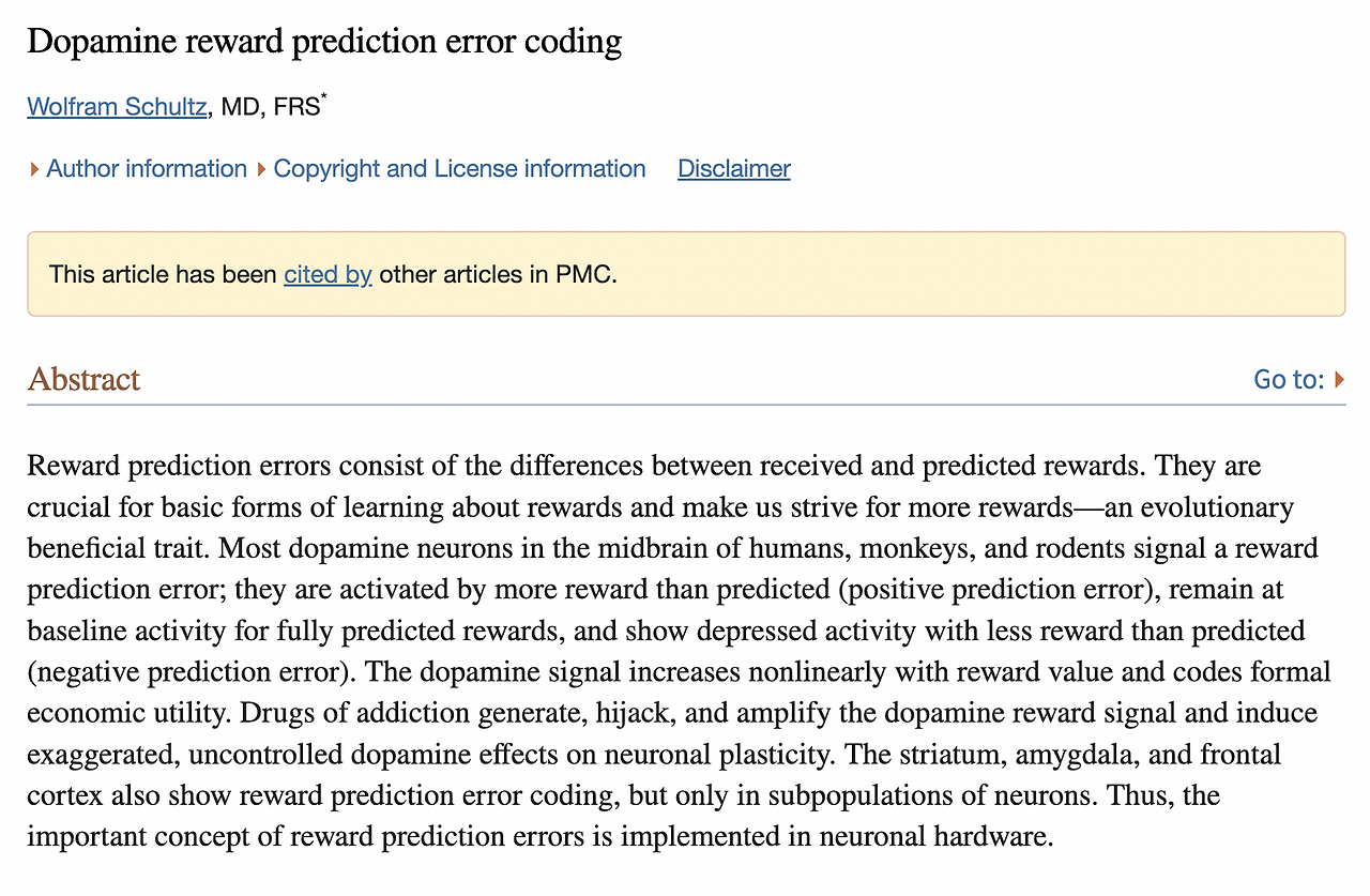 이런 현상을 도파민 보상 예측 오류라고 부르는데, 여러 논문에 따르면 실제 도파민이 '보상이 있을거야' 라고 예측을 해서 갔는데 별거 없고 실망만 할 경우. 이 실망감이 독이 되어 무의식에서 고통 호르몬이 분비된다고 한다. 때문에 더욱 큰 자극을 추구하게 되고. 더욱 큰 보상 예측을 원하게 된다. 실제 담배나 마약에 중독된 사람들의 뇌를 분석해보면. 처음에는 1이라는 자극만 와도 보상이 잘됐던 것이 나중에는 내성이 생겨 이것이 오지 않자 사람이 우울해지고 고통에 빠지게 되면서 2,3의 자극을 추구하게 되었다고 한다. 이런 과정이 반복되다보면 고통과 우울증, 무기력함이 증가하게 된다.