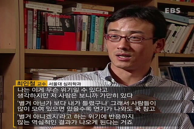 얼마나 사람들이 주변 사람들과 자신이 처한 상황에 세계관이 영향 받는지 보여주는 실험이라고 본다. 이 연기 안에서 가만히 있던 사람들처럼, 나도 주변 사람들이 다 학점을 따니깐 바보 같이 귀중한 시간과 에너지를 이 점수를 따는데 낭비해버렸던 것이다. 그 학점 아무도 안 알아주고, 지금 와서보니 궁금해 하는 사람들이 아무도 없는데도 이 개 쓰잘데기 없는 행동을 무려 4년이나 했다. 그동안 내가 날린 시간과 에너지가 얼마나 컸겠는가.