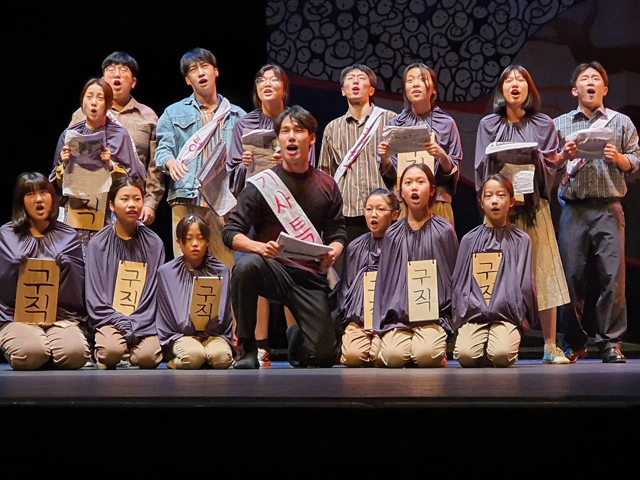 음악극 <태일>은 시대의 풍광을 물러세우는 대신 단 두 명의 배우가 그려가는 태일과 인물들의 관계를 통해 태일의 삶을 구축한다. 반면 <네 이름은 무엇이냐>는 열 명의 배우가 분한 열 명의 태일은 물론 각 지역에서 참여하는 시다 역의 아동 청소년 배우 등으로 다양한 시선을 열어둔다. 영상 등을 통한 시대의 풍광이나 마임, 춤, 노래 등 양식적 표현도 다양한 시선의 자리를 만든다.