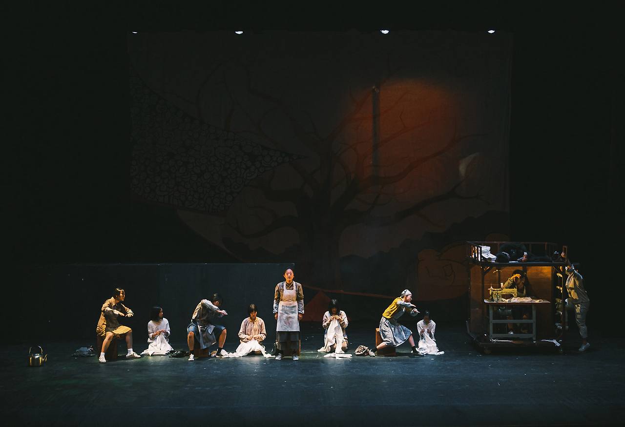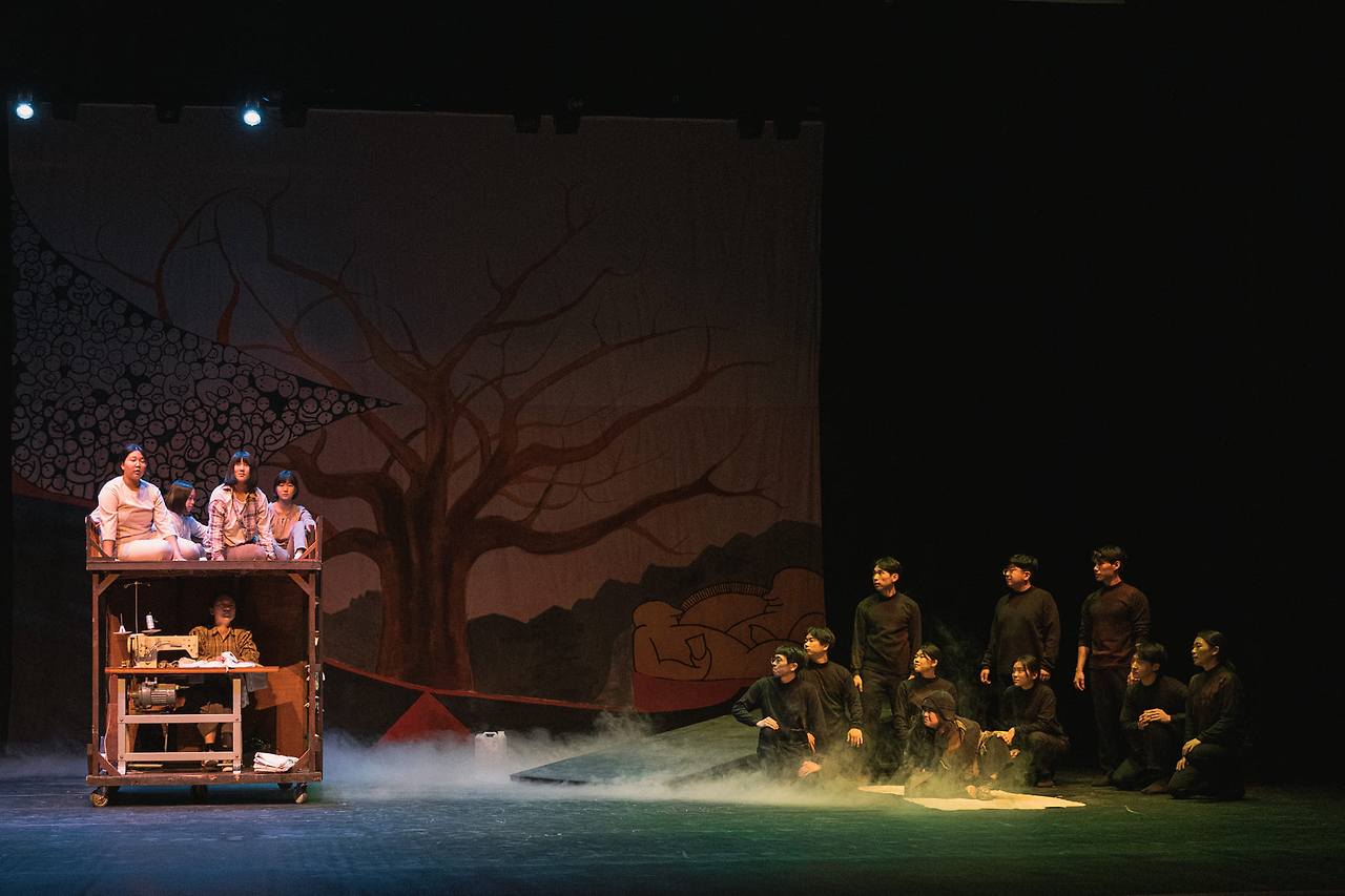 음악극 <태일>은 전태일이 살아낸 시대의 풍광을 포기하는 대신 그가 만났던 사람들 속에서 그의 삶을 그려간다. 태일과 순옥, 태일과 엄마, 태일과 아빠, 태일과 시다, 태일과 바보회 동료, 태일과 근로감독관, 태일과 사장 등등 장면은 오직 두 인물로 전개된다. 이러한 전개는 한편으로 전태일이 살아낸 시대를 뒤로 물러세우는 점이 있지만 다른 한편 태일의 고뇌, 연민, 분노, 실천 등등이 이들과의 만남을 통해 그려지면서 태일을 사람 속에서 성장하는 인물로 다가오게 한다. 예를 들면 이런 장면. 미싱 한 대로 작은 피복공장을 운영하던 아버지가 파산하자 엄마는 돈을 벌기 위해 가족들이 있는 대구를 떠나 서울로 가고 태일은 무작정 서울에 올라와 온갖 잡일을 하며 엄마를 찾는다. 드디어 태일이 엄마를 만난 날, 태일과 엄마는 엄마가 얹혀살던 남의 집 단칸방에 신세질 수 없어 그 집 방문 앞 마루 밑에 눕는다. 식당 일하는 엄마의 앞치마를 이불 삼아 흙바닥에 누운 태일과 엄마의 밤. 이 장면은 한국전쟁 후 도시 빈민의 곤궁함 삶의 증언일 터인데, 연극은 이 장면을 가난의 가혹함만을 전면화하지 않으면서 그렇다고 가난을 낭만화하지도 않고 혈연의 애틋함에 빠지지 않으면서 엄마와 아들, 인간과 인간이 서로를 의지하고 보듬는 아름다운 장면으로 완성한다. 인물과 인물의 관계를 중심으로 한 드라마의 전개는 이후 에피소드에서도 이어진다. 걸어서 집으로 돌아가다가 통행금지에 걸려 한뎃잠을 자고 그렇게 아낀 버스비로 박봉에 끼니도 거르는 어린 시다들에게 풀빵을 사주는 태일은 돈 잘버는 재단사 아저씨라기보다는 엄마와 앞치마를 나누어 덮던 바로 그 태일에서 자라나온 것이다. 즉 청년 남성 재단사와 어린 여성 시다라는 위계적 관계에서의 일방적인 연민이 아닌 의지하고 보듬는 관계로 이어지는 것이다.