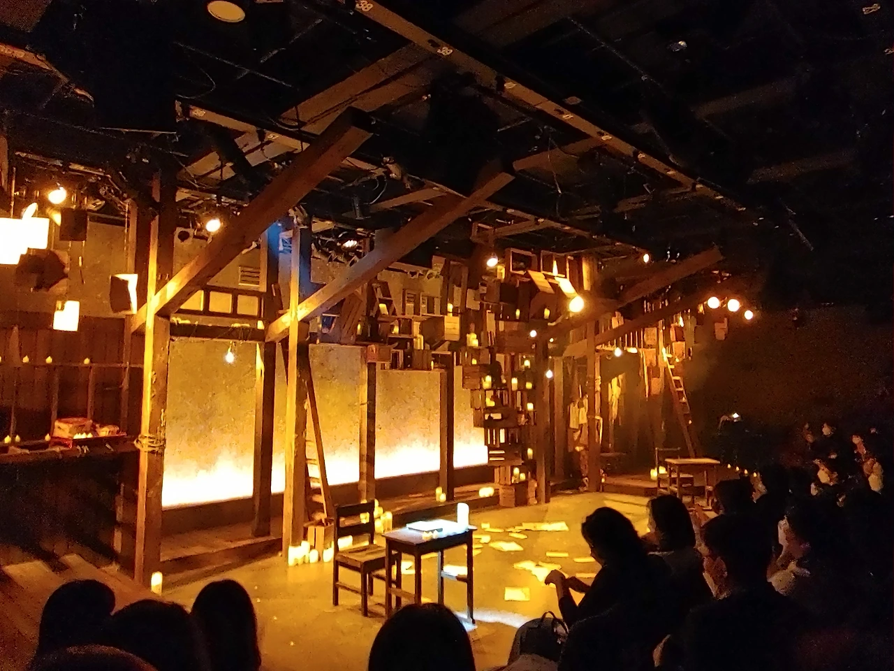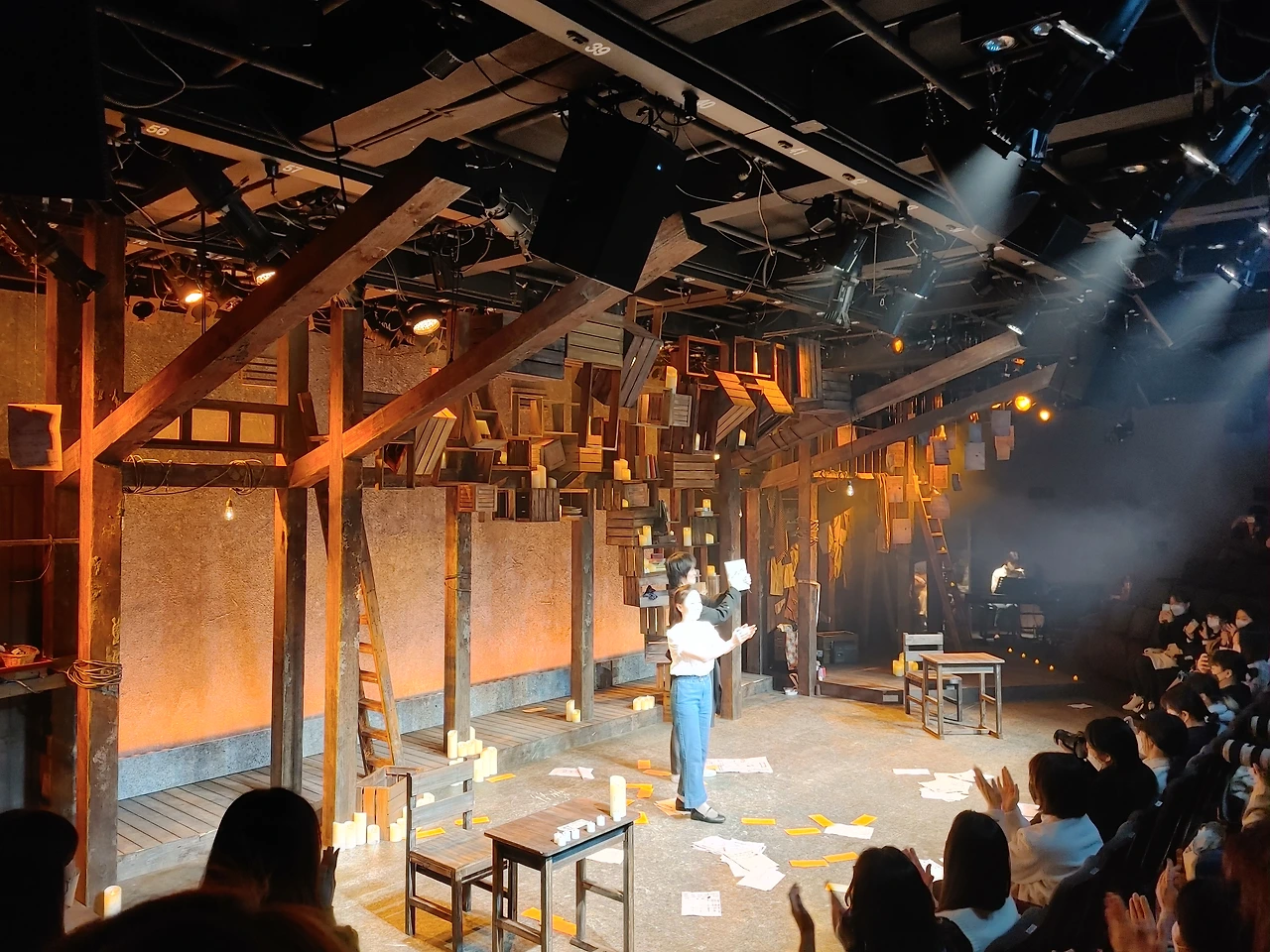 음악극 <태일>은 연극이 전개되면서 무대 위에 하나 둘 촛불을 켠다. 촛불이 조명의 전부인 것은 아니며 극적 상황과 연관된 것도 아니다. 세트 전환이 없는 무대의 특성상 장면 전환 행위이기도 하고, 한 장면 안에서 상황 전환을 위한 행위이기도 하다. 그렇게 하나 둘 촛불이 늘어가다가 연극의 후반부에 이르면 촛불을 켜는 행위가 장면과 장면 사이에 오래 계속되면서 무대 가득 촛불이 일렁인다. 작고 노란 불빛의 질감은, 그자체가 어떤 위기의 전조를 만드는 것은 아니다. 그런데 바로 이 불빛이 무대에 가득 차오를수록 태일의 결단의 사건은 가까워 온다. 영화 <아름다운 청년 전태일>이 제작될 당시 분신 장면에 대한 특수효과가 화제가 되었는데, 영화라는 장르에서 특수효과가 차지하는 비중도 있겠지만 그만큼 결단의 사건은 드라마적으로도 절정의 장면이 아닐 수 없다. 그러나 음악극 <태일>은 태일의 삶이 달려온 결단의 사건에서 라이터를 켠 태일이 무대 뒤로 퇴장한 채 무대 가득 일렁이는 촛불만을 남겨둔다. 그 작고 노란 불빛의 일렁임만으로 이 엄청난 사건을 해석할 수 있을까.