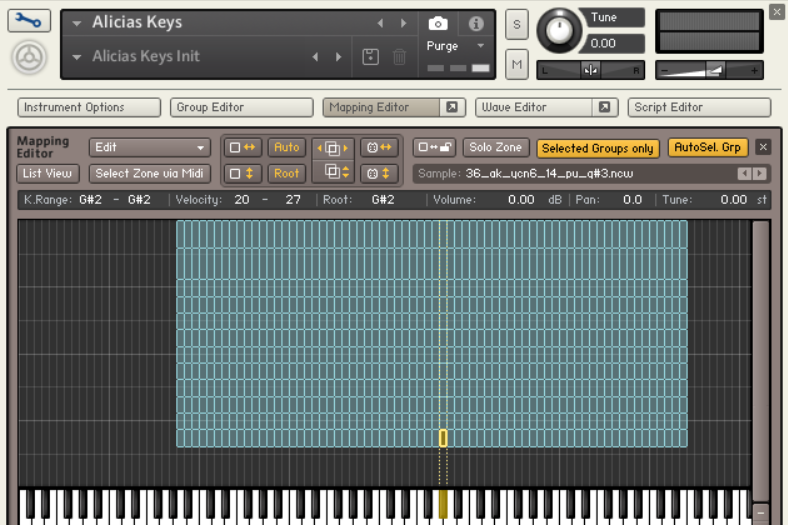 위 사진은 Kontakt에서 피아노 가상악기인 Alicia's Keys를 불러온 모습입니다. 하늘색 네모칸들은 각각 녹음된 소리들입니다. 미디 건반을 누르면 음과 벨로시티(얼마나 건반을 세게 누르는가)가 샘플러로 전송됩니다. 위 사진에서 가로축은 해당 음, 세로축은 해당 벨로시티입니다. 만약 C3 음을 가장 큰 벨로시티로 누른다면 사진에서 C3에 해당하는 건반의 열(column)에서 가장 윗 행(row)의 네모에 해당하는 녹음 파일(하나인지 여럿인지는 알 수 없지만)을 재생할 것입니다.