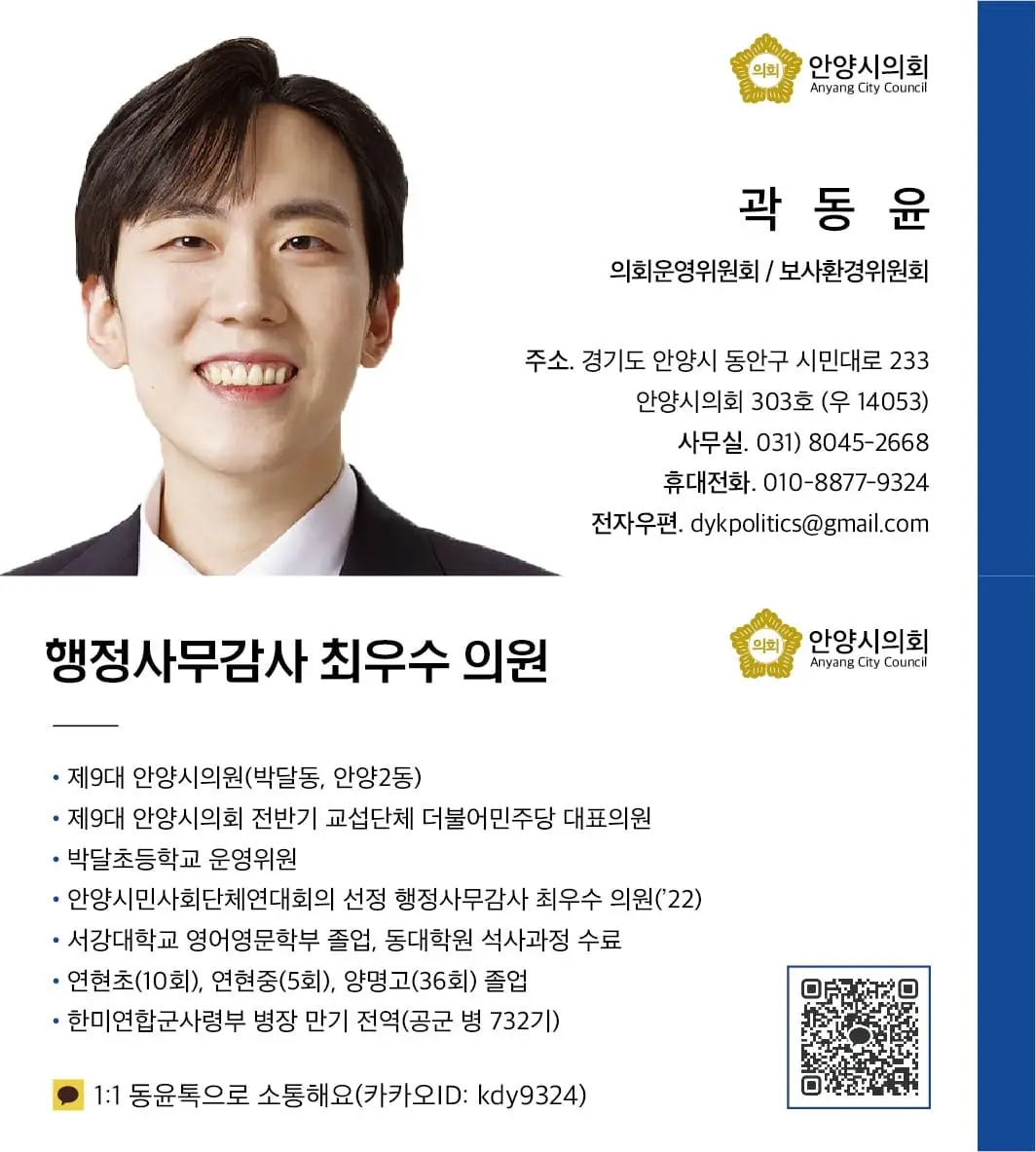 오늘 동윤톡을 받으신 안양2동 주민은 물론 다른 지역의 주민께서도 행정복지센터가 어떤 역할을 하면 좋을지, 어떤 시설이 들어오면 좋을지 자유롭게 의견을 주시면 좋겠습니다. 적극 참고하여 반영할 수 있도록 노력하겠습니다.