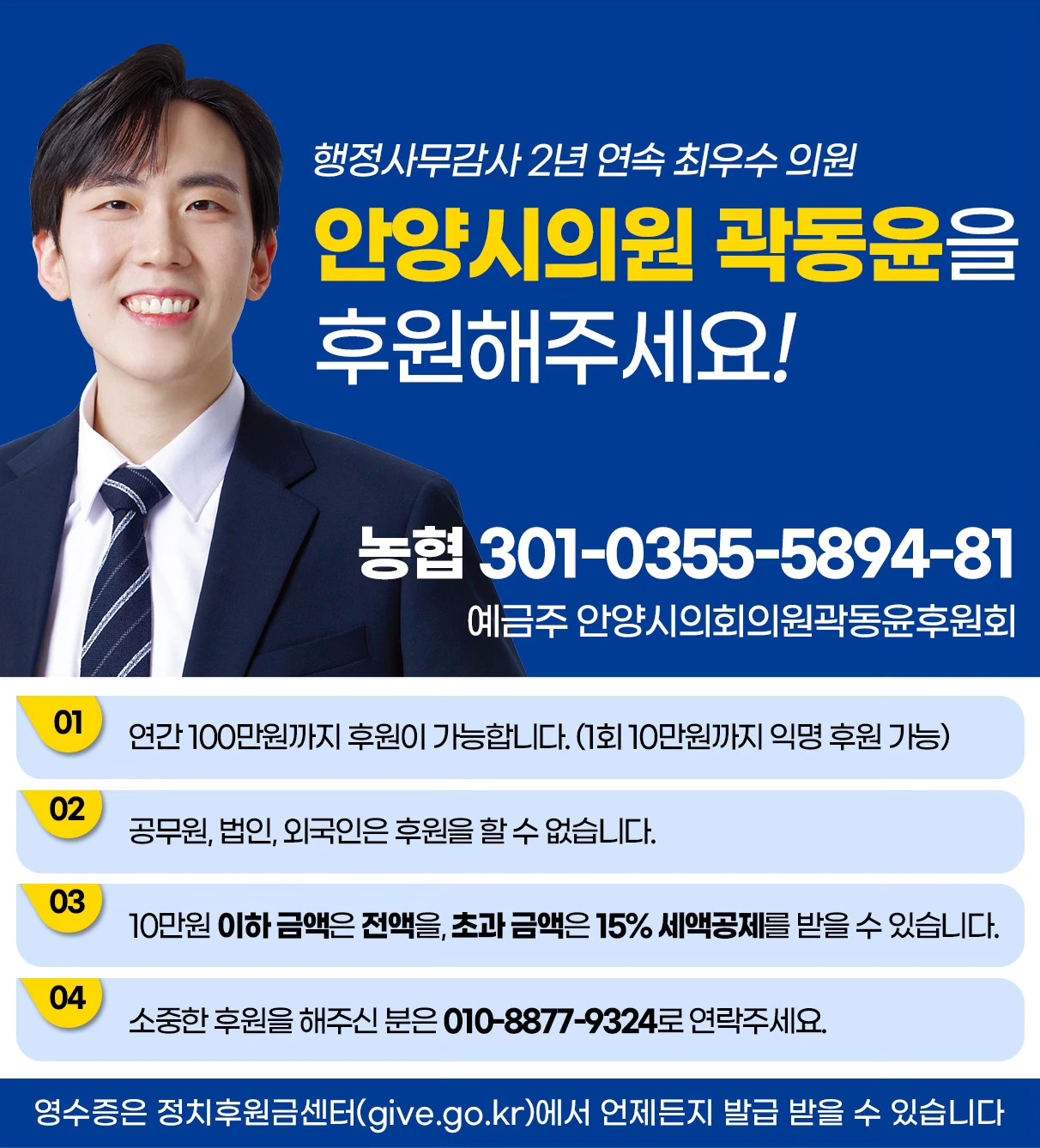 그리고 마지막으로, 2024년이 얼마 남지 않았는데 혹시 후원을 해주실 수 있는 분이 계신다면 적은 금액이라도 안양시의원 곽동윤에게 힘을 보태주시길 요청합니다