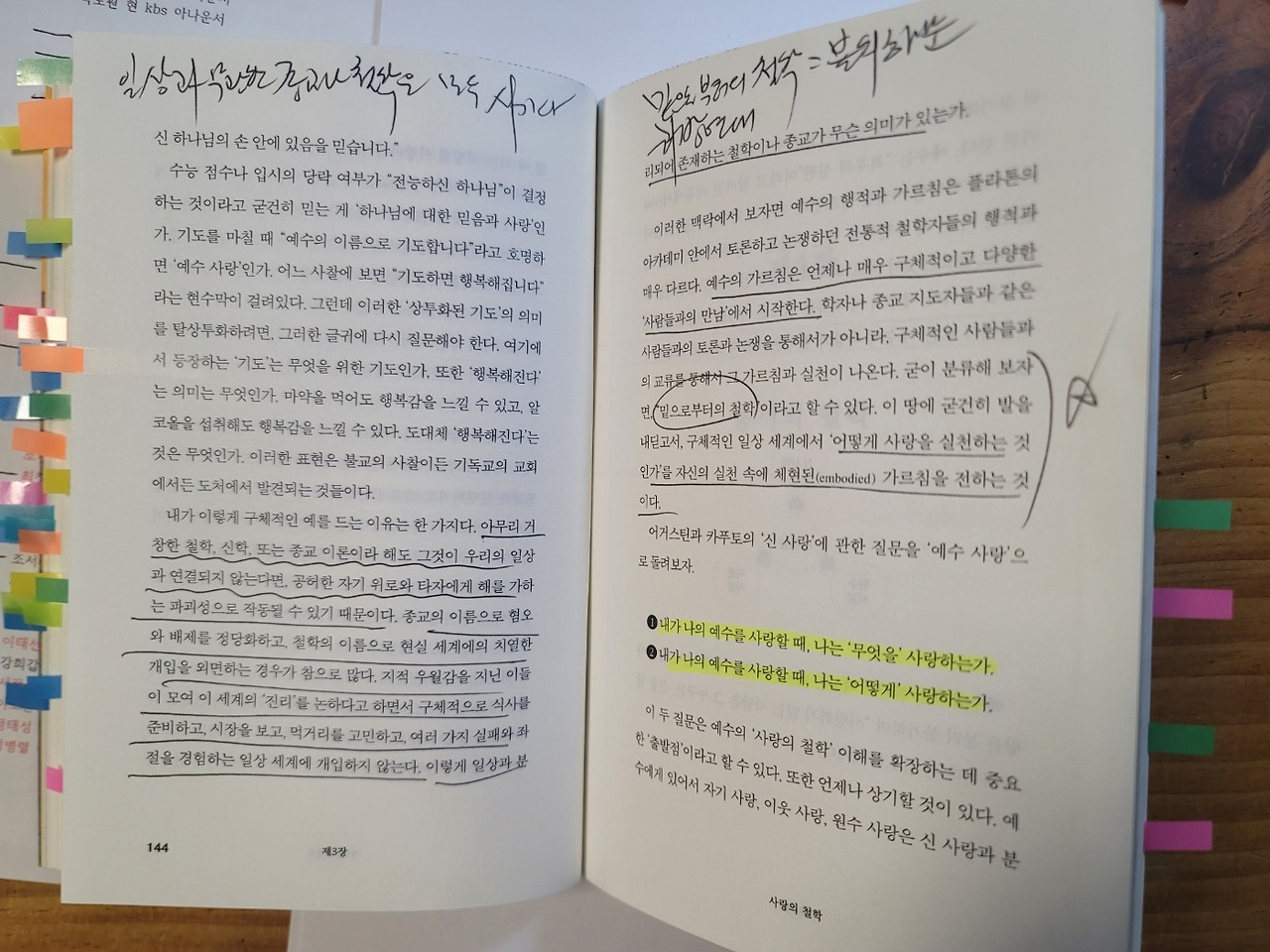 예수는 성경에 나오는 모든 미덕, 사랑, 용서, 환대, 평등과 정의를 화력하고 웅장한 교회당이나 성전, 대학원과 같은 현실과 분리된 별도의 공간에서 삶과 격리된 상태로 말과 글로 전하지 않았다. “구체적인 삶에서 실천함으로써 가르쳤다”(239쪽). 예를 들면 “자기를 사랑하듯 이웃을 사랑하십시오”라고 성경에 나오지만 교회 다니는 기독교인들은 자기 사랑은 물론 이웃을 사랑하지 않는 경우가 많다. 여기서 말하는 이웃은 나와 인식과 관심이 동질적인 이웃만을 의미하지 않는다. 나와 다른 세계에서 다른 생각과 행동을 하면서 살아가는 일상세계의 모든 사람이다. 교회를 다니지 않는 사람이나 다니지 못하는 사람의 속 깊은 마음을 사랑할 때 교회는 기독교인만이 머무는 특권적 장소가 아니라 예수가 평생을 통해 강조한 이웃사랑을 전파하는 만인의 학교로 탈바꿈되어야 한다. 교회를 다니지 않는 사람들의 속 깊은 마음은 과학기술로 측량이 불가능하다. 그들이 오늘도 내일도 뒹굴며 살아가는 격전의 현장으로 내려가 다양한 사람들과 만남을 통해 “밑으로부터의 철학”(145쪽)을 구현해야 한다. 속세를 어쩔 수 없이 살아가는 사람들의 속마음을 알아내기 위해서는 그들과 함께-잘-살아봄을 실천하지 않고서는 알 수 없다. 아랫사람에게 던지는 질문을 부끄러워하지 말아야 한다는 불치하문(不恥下問)의 철학을 예수는 몸소 구현하면서 언제나 ‘사람들과의 만남’에서 마주침의 깨우침을 건져 올렸다.