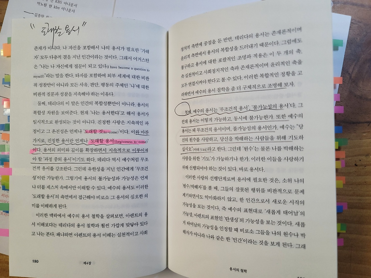 사랑은 한나 아렌트가 이야기하는 ‘탄생성(natality)’과 예수가 실천적 덕목으로 강조하는 용서라는 미덕과도 긴밀한 관계를 맺고 있다. 새로운 탄생 가능성이 일어나기 위해서는 과거의 잘못을 용서하는 진정한 사랑이 뒷받침되지 않고서는 불가능하다. 새롭게 태어남의 가능성은 언제나 과거에 범했던 실수나 죄과를 사랑으로 감싸 안아줄 때 비로소 열리는 새로운 관문이기 때문이다. 예수의 용서는 어떤 조건도 따지지 않는 전제 조건이 없는 무조건적 용서이자 불가능성도 뛰어넘은 용서다. 무엇보다도 예수가 말하는 용서는 한 번으로 완성되는 게 아니라 그 의미와 깊이를 확장하고 심화시키면서 어제와 다른 자세와 태도로 용서하는 ‘도래할 용서(forgiveness to-com)’다. 도래할 용서 속에서 “당신의 죄들이 용서받았습니다”라고 수동태로 표현하면서 주어와 목적어가 선명하게 구분되는 능동태형 용서에 잠재된 용서하는 주체와 받는 객체의 위계적이고 수직적인 종속관계도 무너뜨리는 것이다. 언제나 예수의 가르침은 ‘어느 종교에 소속되어 있는지를 따져 물은 다음 해당 종파가 어떤 교리를 추종하는지를 생각하는 게 중요한 것이 아니라 지금 나와 전혀 다른 세계의 사람들과 어울려 어떻게 잘 살아갈 것인지가 중요하다.
