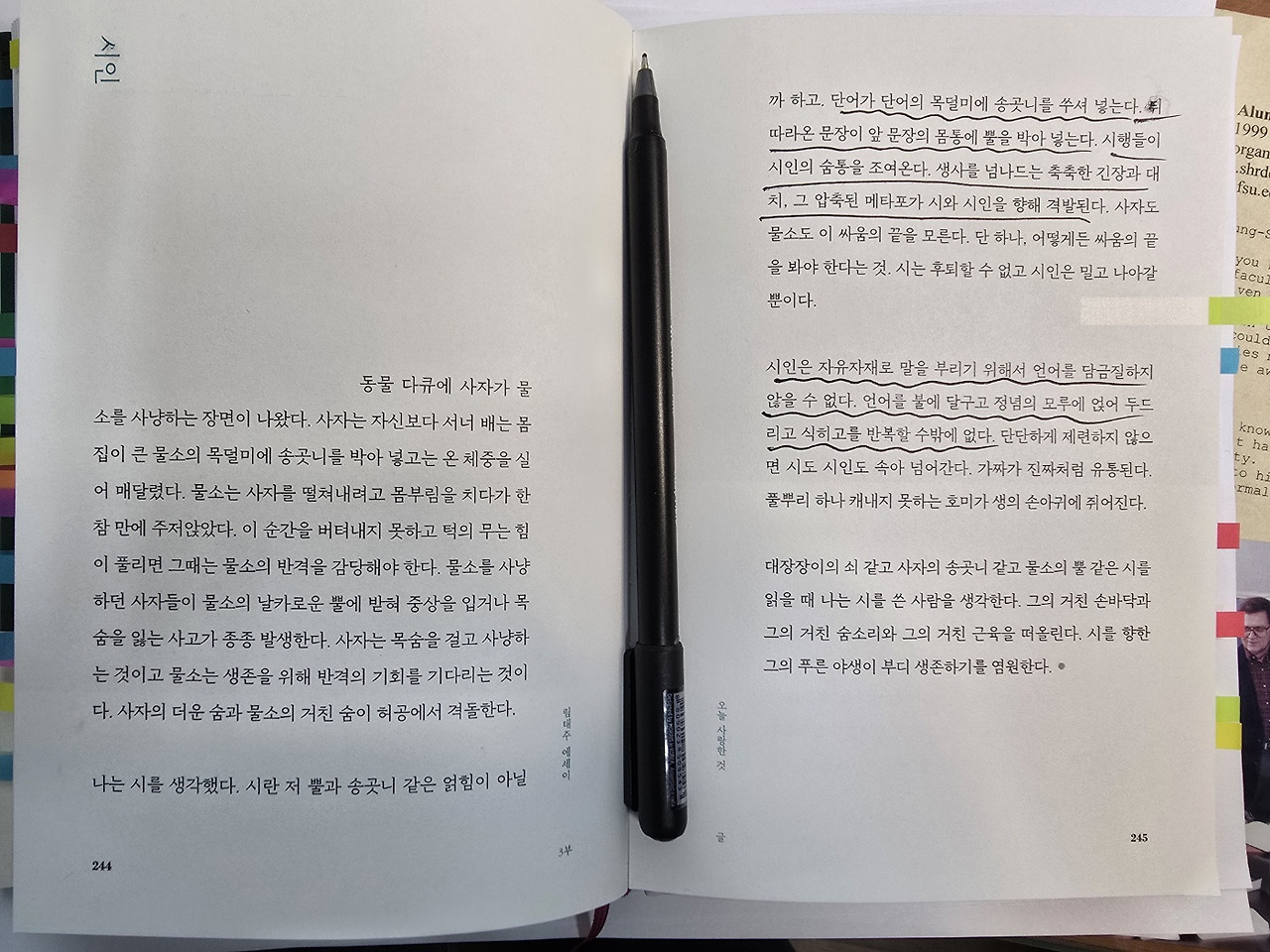 사람도 책도 한 눈에 반하는 책이 있다. 표지 디자인을 통해 책 속의 내용을 드러내려는 보이지 않는 욕망이 포착되고 제목이 제몫을 한다는 예감이 들 때다. 한 눈에 반하는 책의 또 다른 핵심은 저자 소개가 범상치 않을 때다. “육신을 헐어가며 썼고, 시간을 긁어가며 더디게 썼다”는 평범하지만 비범한 문장 속에 글을 쓰며 깊이 고뇌하는 저자의 모습이 그려진다. 표지와 제목에 반하고 저자 소개에 전두엽을 강타당하면 이제 프롤로그와 목차를 보면서 영혼을 갈아 건축한 문장 노동자의 숨결이 들리기 시작한다. 책을 펴자마자 멈출 수 없어서 단숨에 읽어버렸다. 아니 순식간에 읽고 말았지만 읽다가 밑줄 친 문장에 한 동안 머무르다 다시 정신을 차려 읽고 또 읽다가 밑줄을 치며 마침내 다 읽고 말았다. “금방 나온 작품을 대하는 순간 그것이 뿜어내는 빛이 하도 눈부셔 눈멀 수밖에 없었습니다. 또 그것은 천둥과 같아서 귀먹을 수밖에 없었습니다. 또 그것은 갓 삶아낸 감자거나 옥수수 같아서 손에 화상을 입을 수밖에 없었던 것입니다”(4쪽). 김윤식의 《혼신의 글쓰기 혼신의 글 읽기》 중에 나오는 말이다. 림태주 작가의 《오늘 사랑한 것》이 바로 이런 책이다. 고압전류가 흐르다 잔잔한 긴장감이 감돌기기도, 뒤통수를 치는 개념적 의미의 파장이 파도를 치다가 사소한 것에 대한 깊은 사랑과 사연의 밀당이 펼쳐지기도 한다. 서둘러 작가의 책을 읽고 싶은 까닭이다. 작가가 시인서가에서 서성거리며 지나가는 가을바람을 붙잡고 하소연하며 몸을 관통하며 남긴 흔적과 얼룩에서 주워 담은 문장 속의 비밀 화두를 풀어 헤쳐 염탐하고 싶은 충동이 일어났다.
