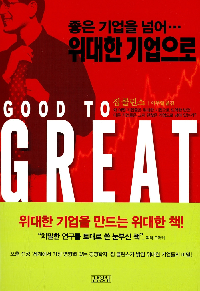 《좋은 기업을 넘어 훌륭한 기업으로》 책을 쓴 짐 콜린스에 따르면 대부분의 기업은 그저 그런 '훌륭한(good)' 기업이지만 어떤 기업은 '위대한(great)' 기업이라는 것이다. 훌륭한 기업을 이끌어가는 리더는 지금 당장 수익창출을 위해 현안 처리에 급급한 리더다. 반면에 위대한 기업을 이끌어가는 리더는 겉으로 보기에는 수줍어하지만 자신이 추구하는 일에 대해서는 엄청난 집중과 몰입을 통해 세상을 위해 보람과 가치를 창출하는 리더다.