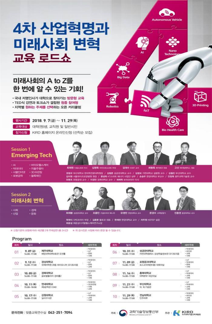 한국과학기술인력개발원이 주관하는 4차 산업혁명이 주도하는 변화의 물결에 대비하기 위해 마련한 기술과 인문이 융합하는 순회강연쇼, 상반기는 지자체, 하반기는 거점 국립대학을 중심으로 하는 순회강연쇼에서 ‘4차 산업혁명 시대, 공부의 패러다임을 바꿔라’로 강연하면서 많은 것을 배웠던 소중한 기회였다. 인공지능이 쉽게 따라잡을 수 없는 인간의 고유한 능력, 예를 들면 호기심을 기반으로 질문하는 능력, 감수성으로 타자의 아픔을 포착해서 협업을 통해 문제를 해결하는 능력, 상상력으로 타자의 아픔을 해결하기 위한 아이디어를 창조하는 능력, 아이디어를 불굴의 의지로 실험을 반복하면서 뭔가를 만들어내는 실천적 지혜를 발굴하고 개발하며 육성하는 교육이 필요하다. 전국 지역마다 천차만별의 반응을 보여주는 청중들 덕분에 지역적 대응전략을 생각해보았던 재미있는 체험이었다. 그럼에도 많은 사람들이 폭소를 터트려주어서 신나게 강연할 수 있었다.