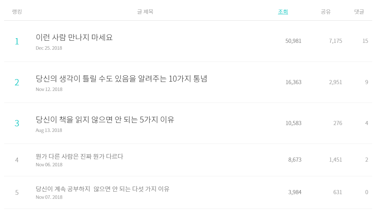 블로그와 페이스북에 글을 많이 써왔지만 브런치에 처음 글을 쓰기 시작한 것은 올 8월이다. 얼마 되지 않았지만 브런치 작가가 글을 쓰면서 느끼는 독자들과의 교감과 공감은 다른 SNS와는 또 다르다. 체험적 깨달음을 특유의 언어적 감각으로 녹여내는 글은 여지없이 독자들의 폭발적인 반응을 얻는다. 한 해 동안 만났던 인간관계를 통해서 깨달은 이야기를 글로 쓴 “이런 사람 만나지 마세요”는 일주일 만에 조회수 5만을 넘겼고 공유 수도 7천을 넘었다. 페이스북에 링크해서 올렸더니 역시 공유수 500을 넘긴 가장 인기 있는 글이 되었다. 가벼운 신변잡기보다 일상에서 깨달은 비상하는 상상력으로 건져 올린 묵직하지만 깊은 사유를 촉발하는 글쓰기는 브런치가 안성맞춤이다. 그동안 쓴 글을 잘 엮어서 책으로 내고 싶다. 브런치 글은 내용도 중요하지만 내용을 한 줄로 뽑아 제목을 만들어내는 노력도 더없이 중요함을 알게 해 주었다.