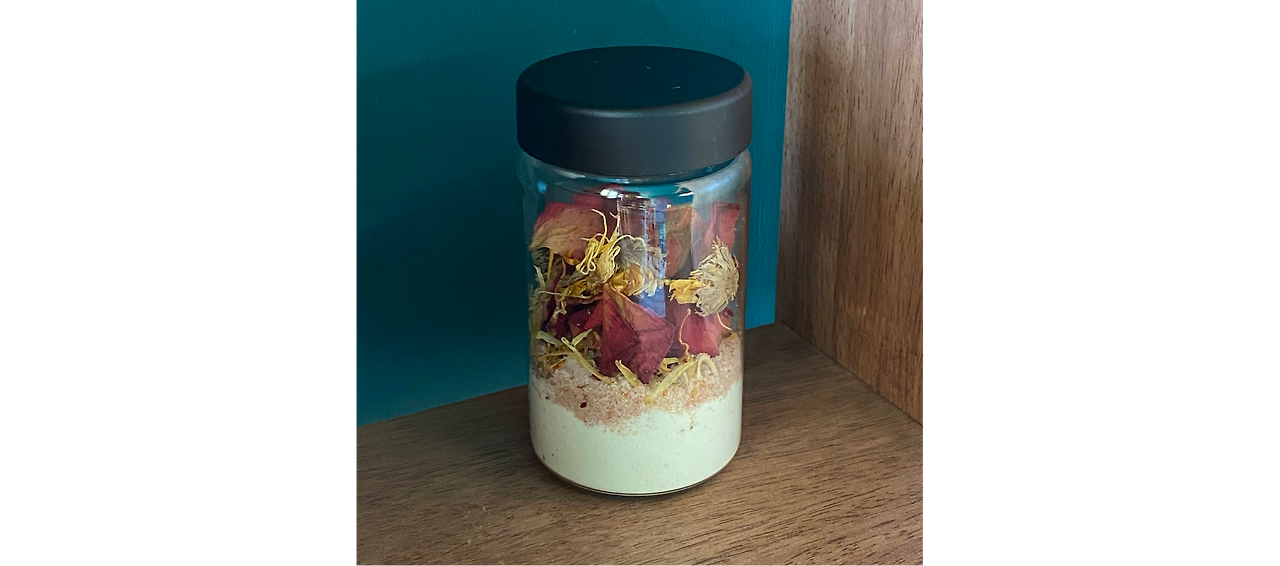입욕제는 우유분말, 히말라야 핑크소금, 말린 장미꽃잎과 말린 메리골드 꽃잎으로 구성됩니다. 우유는 피부를 촉촉하고 부드럽게 하고 물을 뿌옇게 만들어주기 때문에 꽃잎과 대비되는 바탕색 역할을 해줍니다. 삼투압 효과가 있는 소금은 몸의 노폐물을 빼주는 역할을 해주는데 핑크소금으로 한 이유는 우유분말과 색 차이를 내서 구분시키기 위함입니다. (그리고 예쁘죠) 꽃잎은 사치스러운 기분을 위해서 넣었습니다. (우리가 살면서 언제 꽃이 둥둥 떠 있는 물에서 목욕을 해보겠어요) 눈 앞에서 꽃잎들이 떠 있으면 기분이 묘하고 나름 재미있습니다.