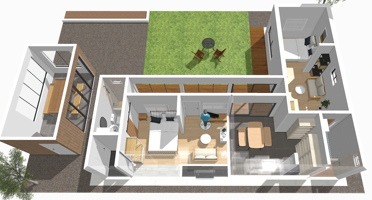 그런데 집 리모델링이 끝날때가 되자 시간은 꽤 많이 흘러버렸고 제 체력과 정신력, 그리고 통장 잔고는 바닥나 있었습니다. 이 지긋지긋한 공사 작업을 좀 끝내고 싶었고 어짜피 돈도 없으니 저 자리는 일단 비워두고 나중에 다시 생각해보기로 했습니다. 반년이 지난 지금의 평가는 어떨까요? '없는것이 훨씬 낫다' 입니다. 왜냐면 집 주변으로 시야가 넓게 탁 트인게 너무 마음에 들기 때문입니다. 벽난로가 조금 아쉽긴 하지만 야외에 더 근사한 불멍 화로를 만들었으니 결과적으로 더 나은 결정을 한 셈입니다. 지금 보니까 이 조감도만 봐도 야외 식사공간때문에 답답해 보이네요. 죽림주간에 직접 와보신 분들은 제 의견에 공감할 것 같습니다 ㅎㅎ