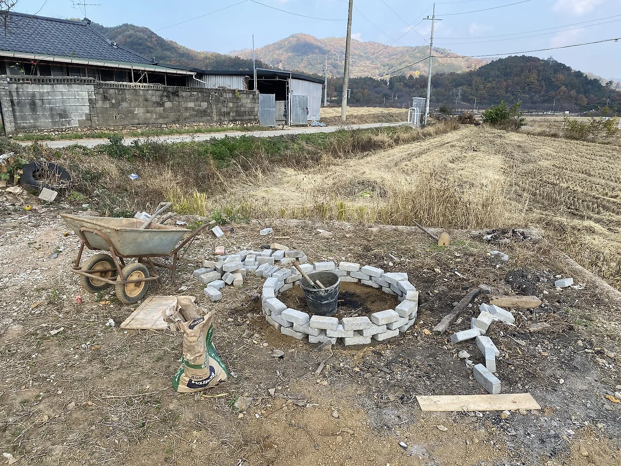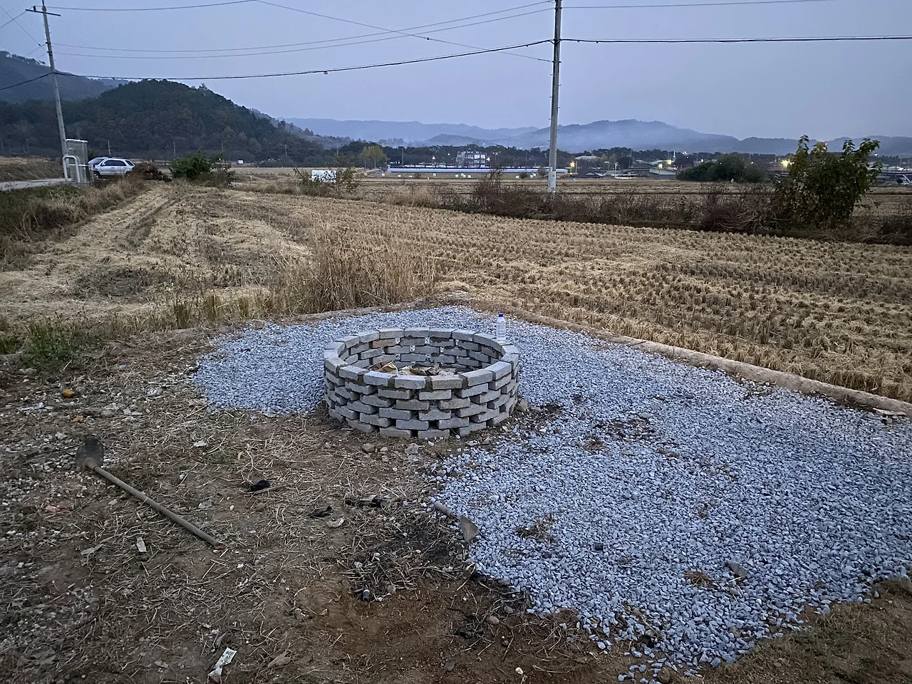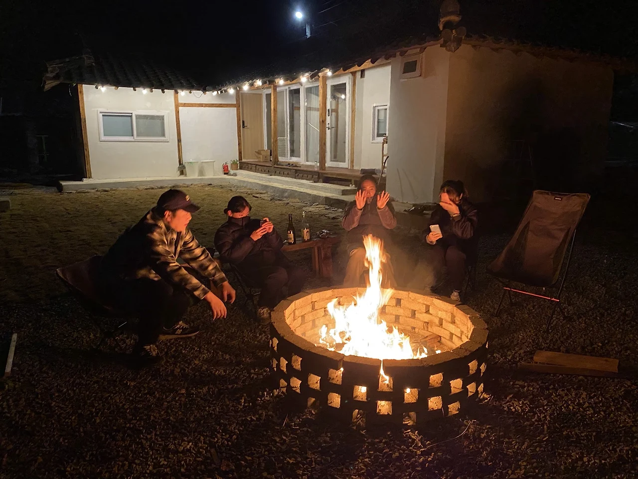 여러명이 들어갈 수 있는 식사전용공간을 만들려는 계획은 접기로 해서 벽난로 계획도 무산되었습니다. 이후 불멍은 잠시 잊고 있다가 작년 11월에 지인들을 초청하면서 시범오픈을 하게되었고 캠핑과 여행을 좋아하는 친구 네명을 초대하게 되었습니다. 그 친구들은 분명히 불멍을 좋아해 줄 것이라는 생각이 들었고 주변에 남아있던 벽돌을 쌓아서 널찍한 원형 화로대를 만들었습니다. 공사기간동안 어깨너머로 전문가들에게 배운 조적실력을 발휘해보고 싶었기도 했고 그 자리가 예전에 철거작업을 하면서 나온 쓰레기를 여러번 불태웠던 장소였으니까요. 그 자리는 제가 검증을 마친 상태였습니다.