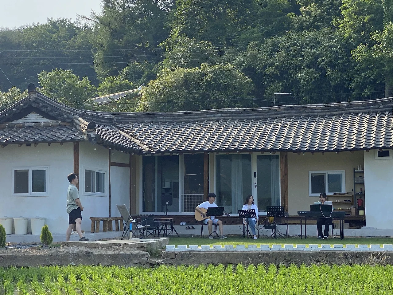 첫 번째로 생각한 소프트웨어는 인디밴드의 버스킹 공연입니다. 시골에서도 이따금씩 마을축제가 열리긴 하는데요. 저는 전문MC가 출동하고 트로트 가수들이 출연하는 그런 요란하고 흥겨운 노래잔치를 상상하진 않았습니다. 여기 마을은 작기도 하거니와 조용한 점이 매력이고 무엇보다 자연풍경이 끝내주니, 그런 분위기와 어울리는 잔잔한 노래와 차분한 뮤지션들이면 좋겠다고 생각했습니다. 그래서 인스타그램으로 버스킹을 하는 인디뮤지션들을 찾아서 다짜고짜 연락을 돌려 제 소개를 하고 공연계획을 설명했는데요. 기획이 생소했기 때문인지, 1일 숙박권이 보상의 전부라는 설명 때문인지, 수도권에서 거리가 멀기 때문인지 답변조차 듣기 어려웠습니다. 외부 뮤지션이 제 생각에 동참해주지 않으면 할 수 없는 프로젝트인데 다행히 대구에서 활동하는 한 밴드가 긍정적인 연락을 해 왔고 지난 6월의 어느 일요일에 죽림주간 최초로 야외 게릴라 버스킹 공연을 할 수 있었습니다. 이름은 '촌서트'라고 붙여봤는데요. 밴드가 공연할 때 저는 뮤직비디오를 찍었고 영상작업은 거의 마무리되어 곧 유튜브에 올릴 예정입니다. 영상이 업로드되면 밴드소개와 그날의 자세한 뒷 이야기들을 정리해서 포스팅해보겠습니다.