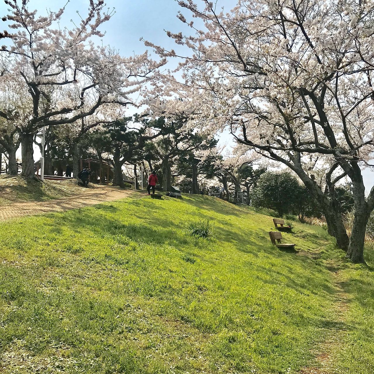둘째날 아침 숙소에서 나와서 제주항 방향으로 걸었습니다. 저는 물을 무척 좋아합니다. 그냥 발이 저절로 그쪽을 향하게 되는데 그러다 오른쪽으로 난 샛길로 꽃나무가 보여 걸어 올라갔습니다. 4월에 꽃이 피는 제주로 놀러오게 된다면 꼭 사라봉을 올라가보세요. 저는 제주항쪽에서 올라가서 충혼각 쪽으로 내려왔는데 다른 코스도 분명히 경치가 좋을거라 생각합니다. 바람에 흩날리는 꽃잎들과 여유롭게 산책하고 운동하는 사람들이 제주바다를 배경으로 아름다운 그림을 만들어내고 있었습니다. 충혼각 쪽으로 내려오는 계단도 멋있었습니다. 지금보니까 이 길이 올레길 18코스네요. 그렇다면 반대편인 별도봉으로 향하는 나머지 18코스길도 분명히 멋있을거라 생각합니다. 저는 서귀포에 있는 친구를 만나러 가야했고 배가 슬슬 고파져왔기 때문에 아쉽게도 그만 내려와야 했습니다. 내려오는 길에 정육점인지 식당인지 애매한 곳에서 점심을 먹었습니다.