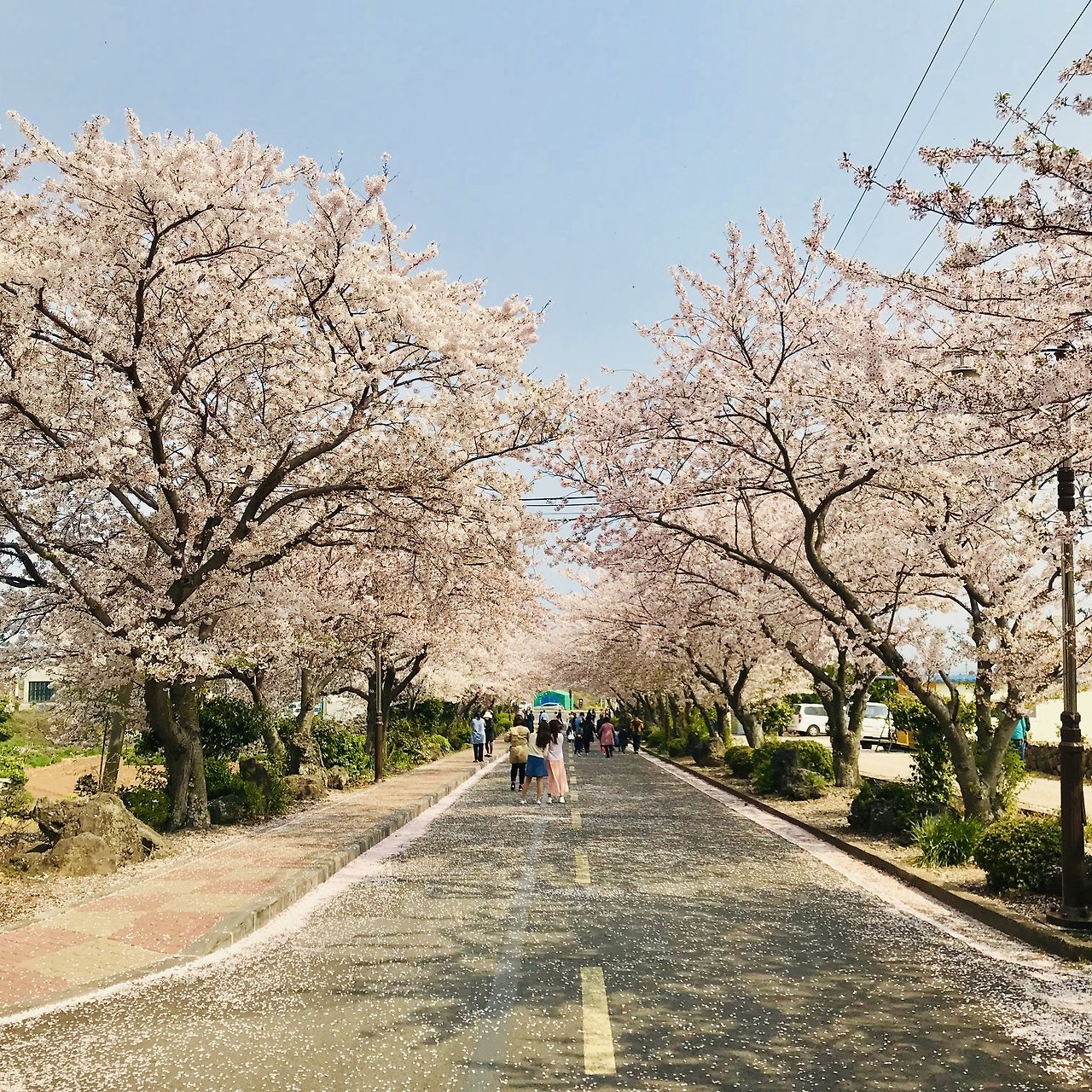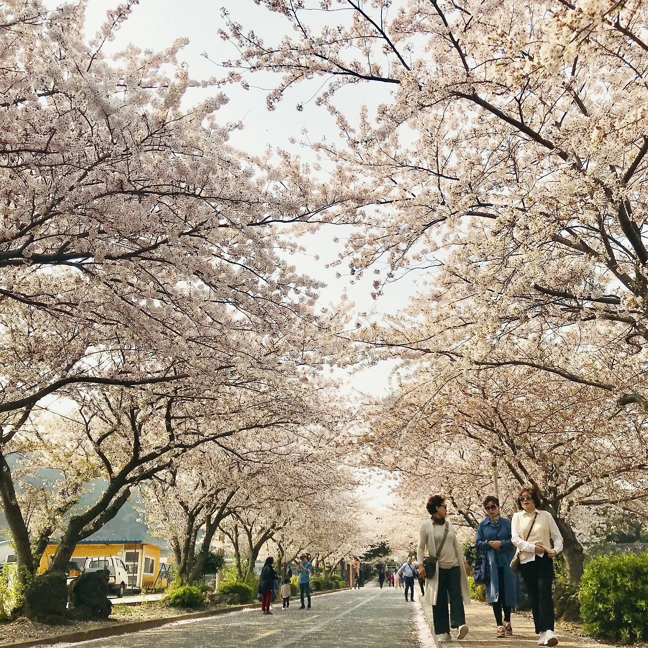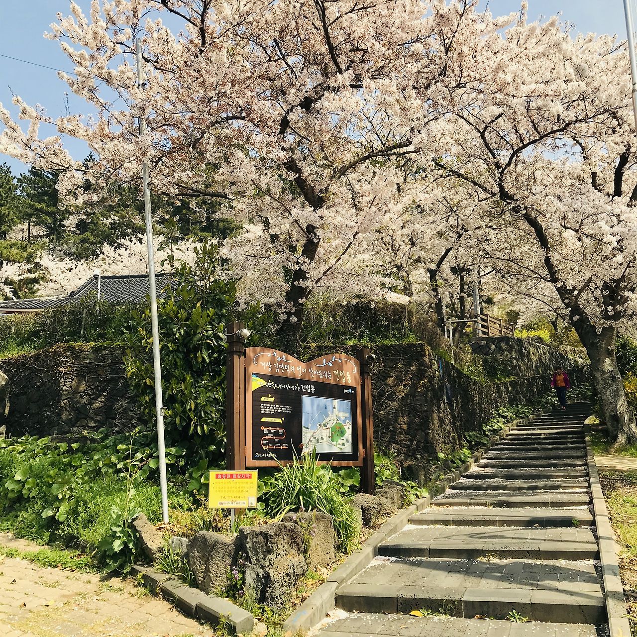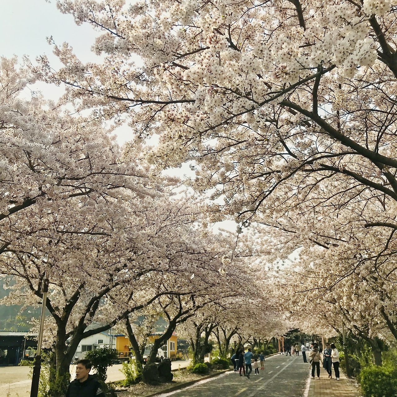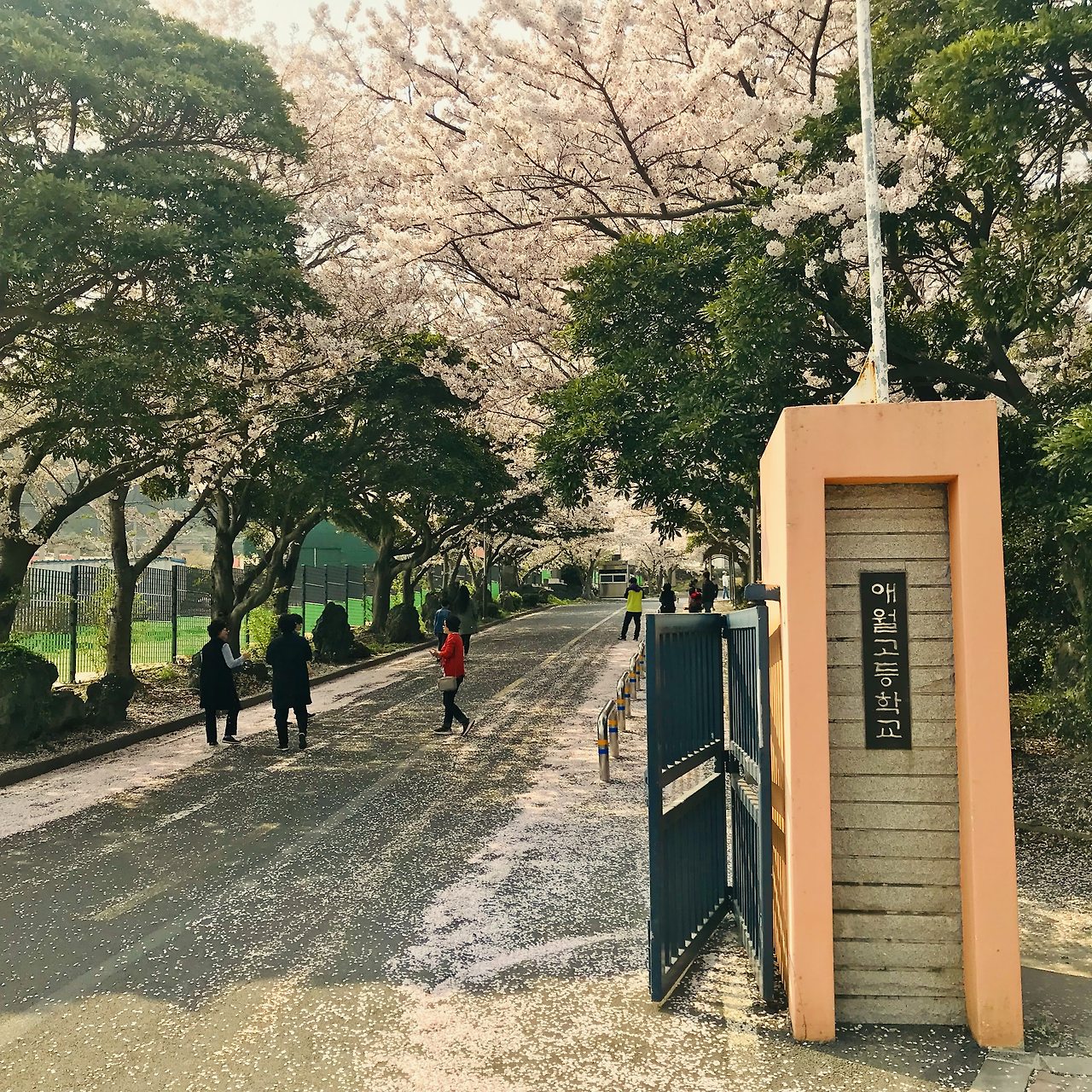 호랑이주택의 집사인 후배에게 작별인사를 할 때, 남은 하루동안도 역시 꽃을 볼 예정이라고 하니까 애월고등학교를 추천해줬습니다. 고등학교? 등교길의 짧은 꽃길이 예상되었습니다. 인천 자유공원 근처 인성여자고등학교에도 꽃이 아주 예쁘게 피는데 주말이면 일반인들도 학교 안으로 들어가서 구경하곤 합니다. 후배가 추천해준 곳이 궁금하기도 했고 대충 거리를 재어보니 그곳부터 해안길을 걸어도 충분하겠다는 생각이 들었습니다. 고등학교 정류장에 내려보니 역시나 길지않은 등교길이었지만 오래된 나무에서 뻗어나온 가지가 풍성하여 과연 멋있는 꽃길이었습니다. 어디서 이런 멋짐을 전해 들었는지 아주머니들과 연인들, 어린이들이 놀러와 사진을 찍고 있었습니다. 이렇게 풍성한 꽃길을 나름 한산하게 구경할 수 있는것도 행운이라 생각했습니다. 서울근교 같았으면 꽃이 부실했거나 사람들로 미어터져 이런 한적함은 상상도 못했을테니까요.