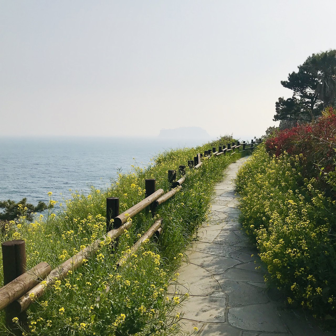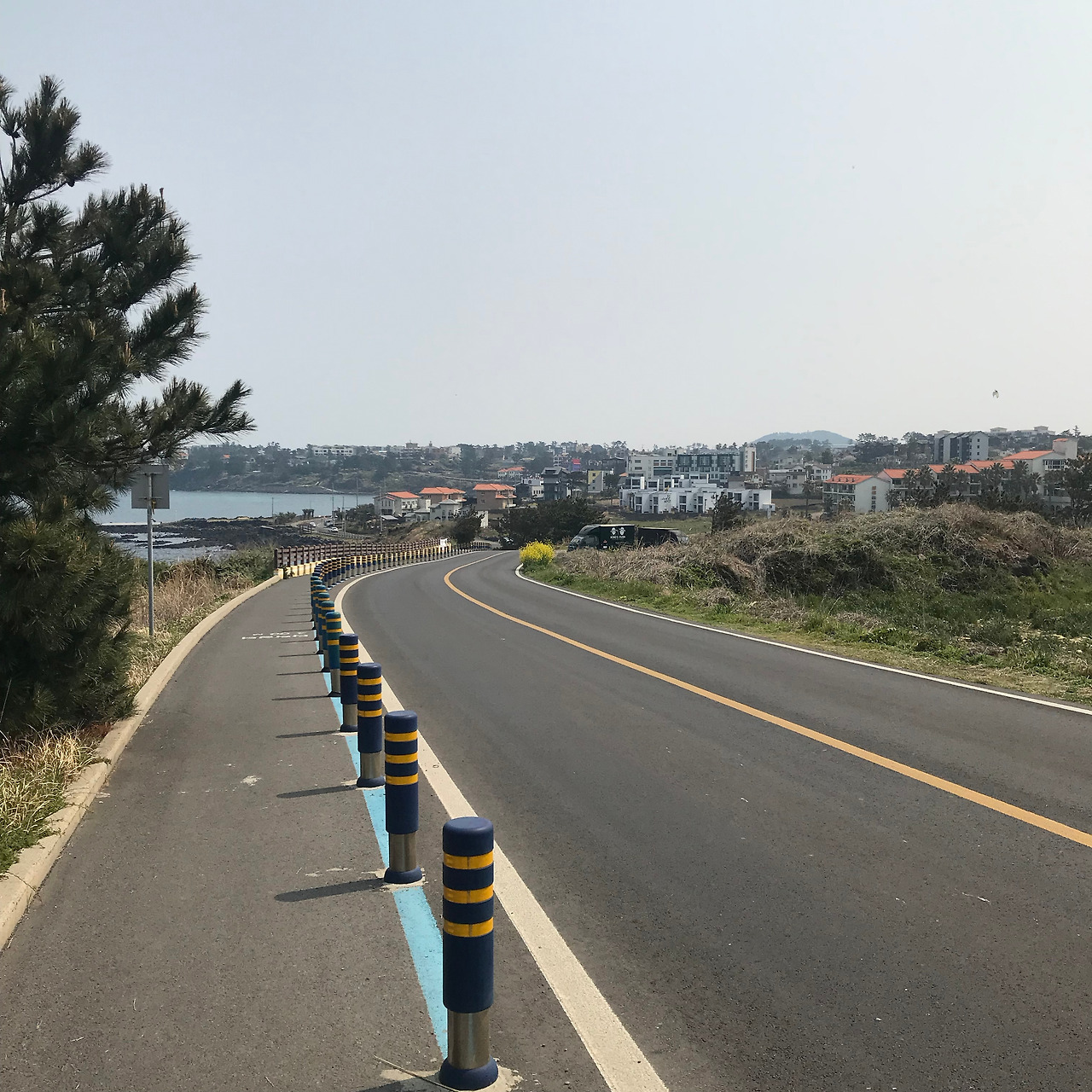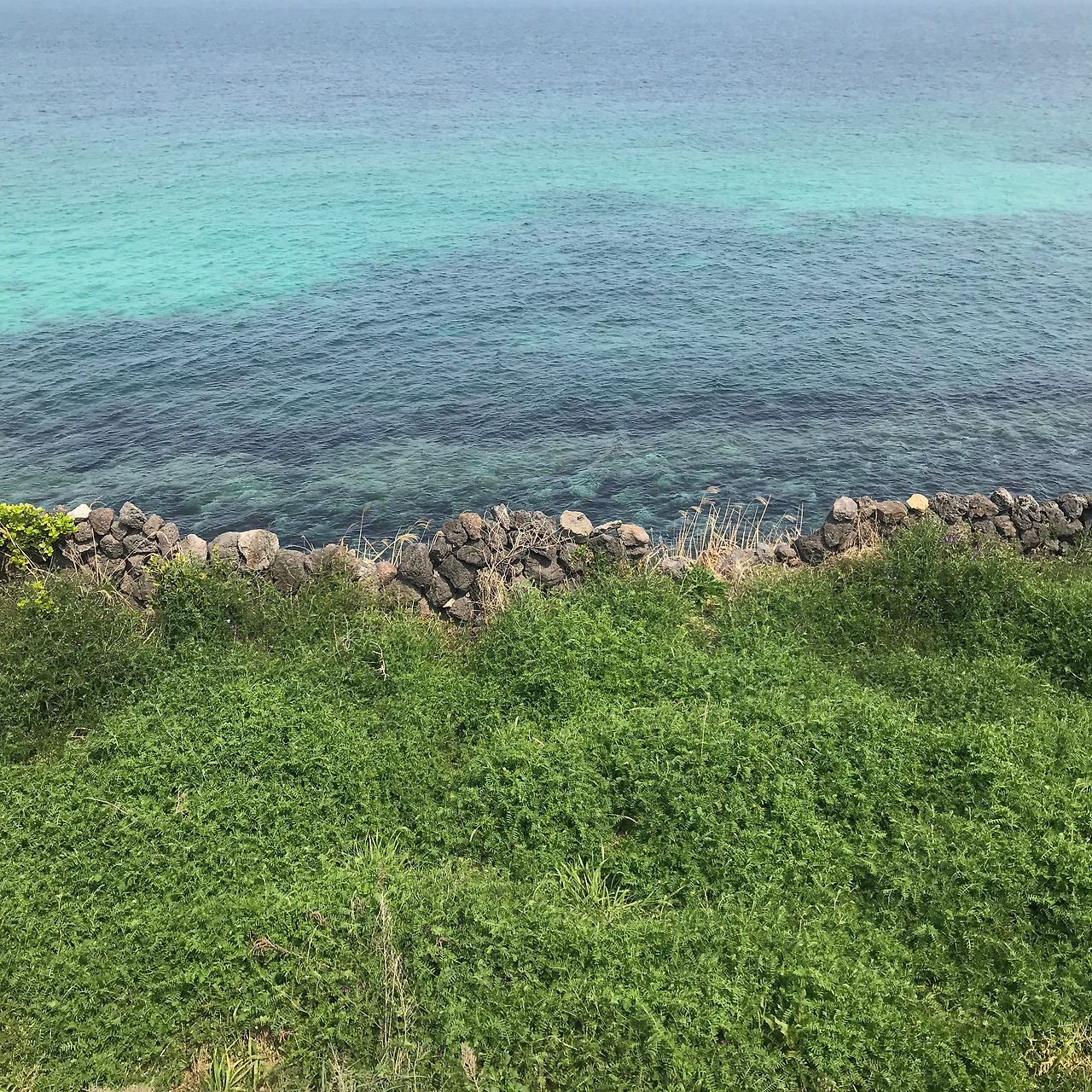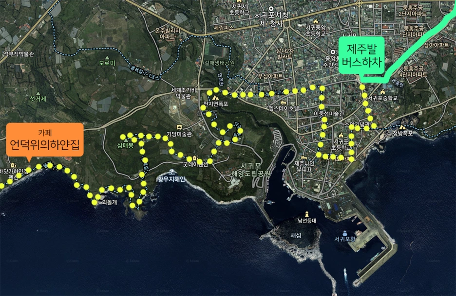 몸이 약간 좋지 않아서 약을 사먹고 서귀포행 버스를 탔습니다. 성판악을 지나는 코스였는데 아무래도 한라산에 가깝게 지나기때문에 구불구불한 길이 많아서 어지러웠습니다. 이럴때는 도쿄여행때 하코네에서 훨씬 더 구불구불한 비탈길을 올랐던 버스경험이 생각납니다. 시내버스임에도 비용은 거의 만원에 가까웠지만 기사님의 안정된 운전과 승하차시에 차분히 기다려주는 자세는 너무나 감동적이었어요. 만원이 결코 아깝지 않았던 경험이었습니다. 의외로 서귀포는 금방 도착했습니다. 친구네집은 서귀포의 구도심이 아니라 2청사가 있는 신도심에 있었습니다. 바로 집으로 가버리면 뭔가 아쉬워서 일부러 서귀포 구도심의 가장 오른쪽에서 내려서 걸어가보기로 했습니다. 역시나 바닷가로 향하는 발걸음은 가볍습니다. 뻥 뚫려있는 하늘과 바다냄새와 소리, 가로수도 어딘가 바다의 향기를 머금고 있는 것 같습니다. 날이 무척 좋아 기분도 상쾌했지만 나중에 알고보니 이 날은 서울을 비롯한 전국 어느곳보다 제주의 미세먼지가 최악이었던 날이었습니다. 그래도 어쩔 수 없지요. 길이 무척 맘에 들었으니까요. 그렇게 사라봉에 이어서 올레길을 또 만나게 됩니다.