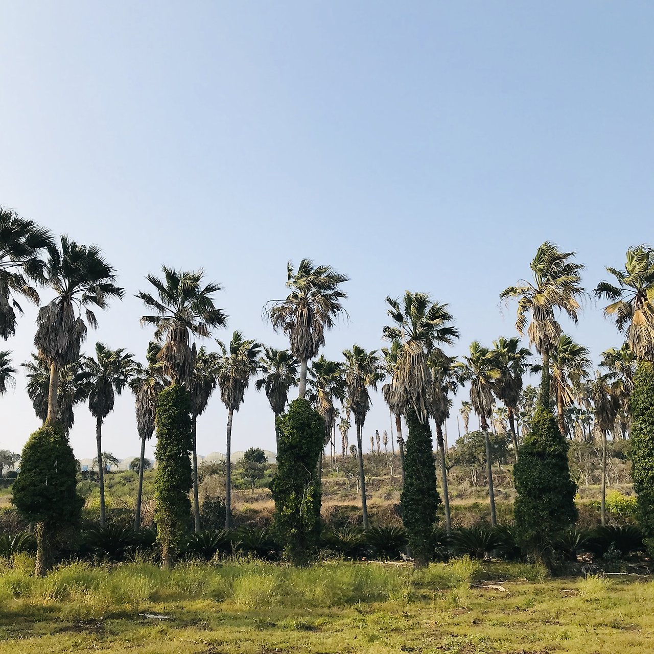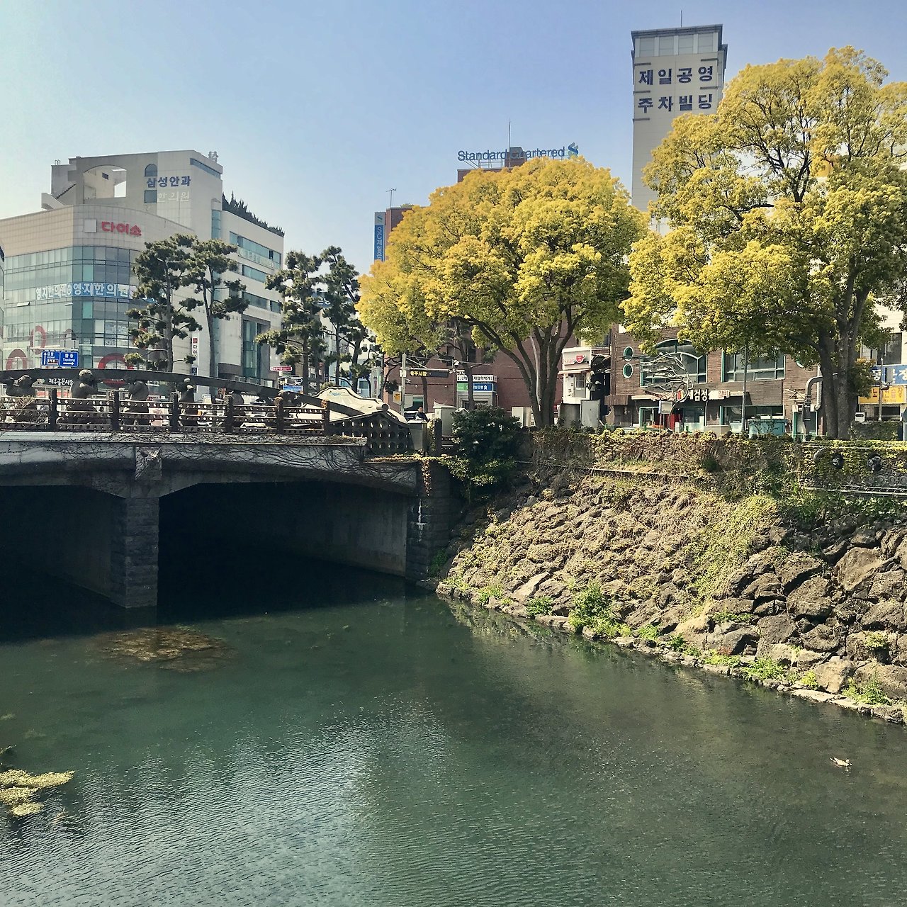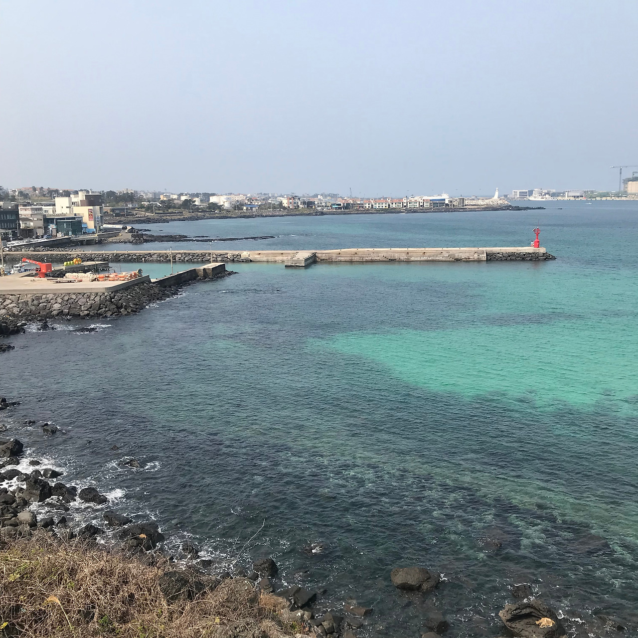 몸이 약간 좋지 않아서 약을 사먹고 서귀포행 버스를 탔습니다. 성판악을 지나는 코스였는데 아무래도 한라산에 가깝게 지나기때문에 구불구불한 길이 많아서 어지러웠습니다. 이럴때는 도쿄여행때 하코네에서 훨씬 더 구불구불한 비탈길을 올랐던 버스경험이 생각납니다. 시내버스임에도 비용은 거의 만원에 가까웠지만 기사님의 안정된 운전과 승하차시에 차분히 기다려주는 자세는 너무나 감동적이었어요. 만원이 결코 아깝지 않았던 경험이었습니다. 의외로 서귀포는 금방 도착했습니다. 친구네집은 서귀포의 구도심이 아니라 2청사가 있는 신도심에 있었습니다. 바로 집으로 가버리면 뭔가 아쉬워서 일부러 서귀포 구도심의 가장 오른쪽에서 내려서 걸어가보기로 했습니다. 역시나 바닷가로 향하는 발걸음은 가볍습니다. 뻥 뚫려있는 하늘과 바다냄새와 소리, 가로수도 어딘가 바다의 향기를 머금고 있는 것 같습니다. 날이 무척 좋아 기분도 상쾌했지만 나중에 알고보니 이 날은 서울을 비롯한 전국 어느곳보다 제주의 미세먼지가 최악이었던 날이었습니다. 그래도 어쩔 수 없지요. 길이 무척 맘에 들었으니까요. 그렇게 사라봉에 이어서 올레길을 또 만나게 됩니다.