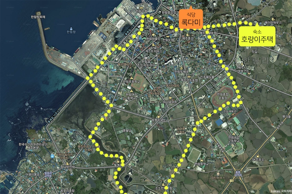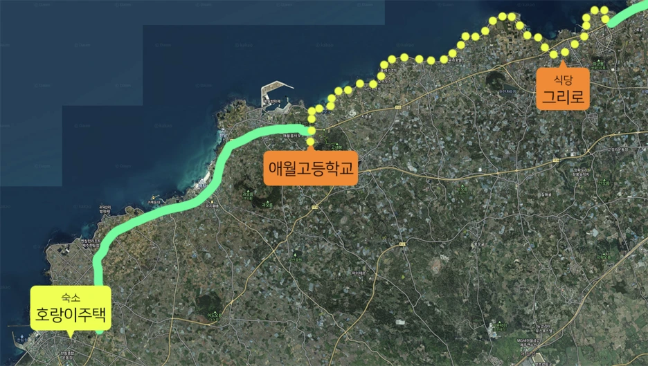 호랑이주택에서의 밤은 순조로울 줄 알았는데 같이 자는 20대 초반 청년이 코를 너무 심하게 고는 바람에 한시간이나 뒤척였던 것 같습니다. 저는 언제 어디서나 잠을 잘 자는 편입니다. 아주 예전에 대학 친구들과 목포에서 제주로 가는 배 안에서 저를 제외한 거의 모든 사람이 멀미를 하고 심하게 고생을 할 때에도 저는 편하게 잤을 정도였으니까요. 그런데 나이가 들어서인지 아니면 방심한 탓이었는지, 너무 오랜만에 코를 심하게 고는 사람 바로 아래에서 자야해서인지 너무 잠이 안왔습니다. 잠에 들기 전, 그 청년이 저한테 아주 다정하게 경고를 하긴 했는데 저는 빈 말인줄로만 알았습니다. 하긴, 그 때 알았더라도 어떻게 할 방법은 없었으니까 결과는 다르지 않았을겁니다. 그렇게 아주 힘든 밤을 보내고 다음날 저는 한림을 떠났습니다. 그 친구때문에 떠난건 절대 아니고 바닷길을 따라 걷고 싶어졌으니까요. 넷째날이 되었는데 저는 다섯째날 아침 일찍 출발하는 비행기라 아무래도 제주시에서 마지막 밤을 보내는게 나을 것 같았습니다. 그래서 한림에서 제주시까지 걸어가면 되겠다 싶었는데 의외로 꽤 멀더군요. 제가 제주도를 너무 쉽게 보는 경향이 있는 것 같습니다.