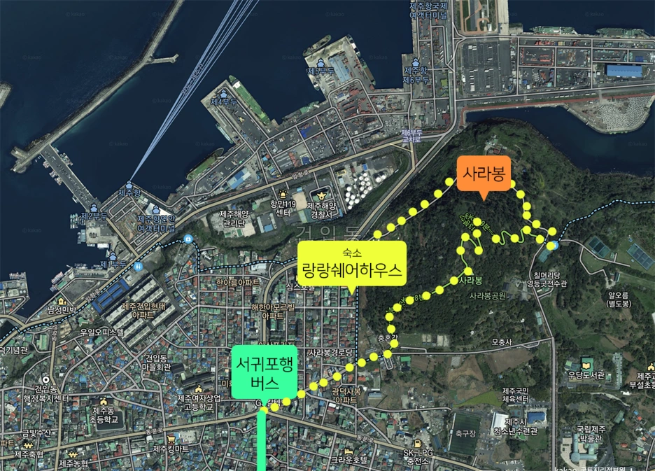 숙소의 본질부터 이야기하자면 괜찮습니다. 잠을 잘 잤으니까요. 그도 그럴것이 손님이 저 밖에 없었습니다. 그 넓은 공용공간을 저 혼자서 사용하니 뭔가 기분이 좋았습니다. 오랜만에 제주에서의 하룻밤이라서 여행자들끼리의 어색하면서도 낯선 대화들을 맥주와 함께 은근 기대했었는데 그런 일은 일어나지 않았습니다. 대신 하루전날부터 목이 아프고 감기기운이 있어서 뜨거운 샤워를 하고 옷을 껴입고 전기장판을 아주 뜨겁게 하고 잤습니다. 아무도 없어서 좋아하는 노래를 살며시 틀어놓고 잘 수 있었습니다. 주인장의 별다른 센스는 전혀 느껴지지 않았지만 기본에 충실한 숙소였습니다. 대신 위치에 많은 점수를 주고 싶은데, 그 이유는 사라봉 때문입니다.