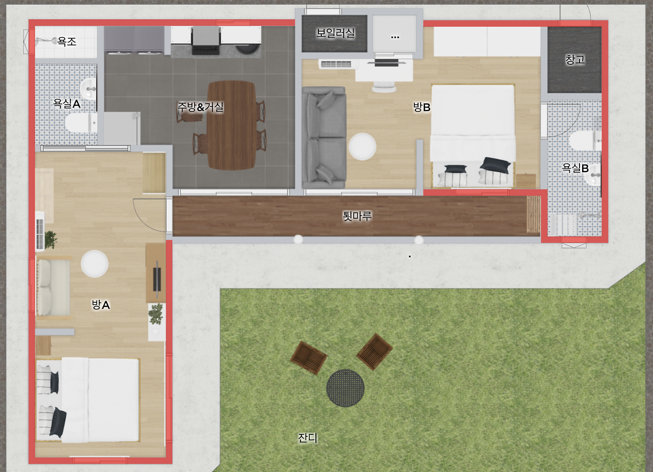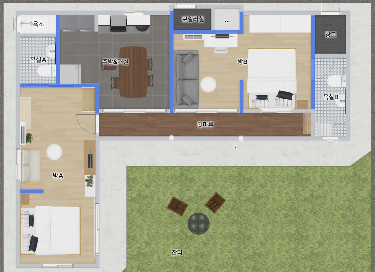 기존 흙벽은 시멘트벽돌 한장 사이즈인 9cm정도밖에 되지않아 단열에 취약해보였습니다. 한옥의 외관을 살리기위해서 흙벽 바깥이 아닌, 안쪽으로 보완해주어야 했는데요. 단열을 우수하게 만드려면 벽이 그만큼 두꺼워져야 하는데, 문제는 실내공간이 그만큼 줄어든다는게 문제였습니다. 우선 HomeByMe 웹툴로 창호의 위치와 사이즈, 방식을 최종 확정했습니다. 전문가나 주변인들의 조언을 받긴 했지만 창호 역시 집주인의 취향을 타기 때문에 딱히 정답이 있지는 않습니다. 그래도 지금 보면 아쉬운 결정들이 몇개 있는데요. 이런 점들은 나중에 다시 집을 지을 기회가 있다면 고마운 교훈으로 남을 것 같습니다.