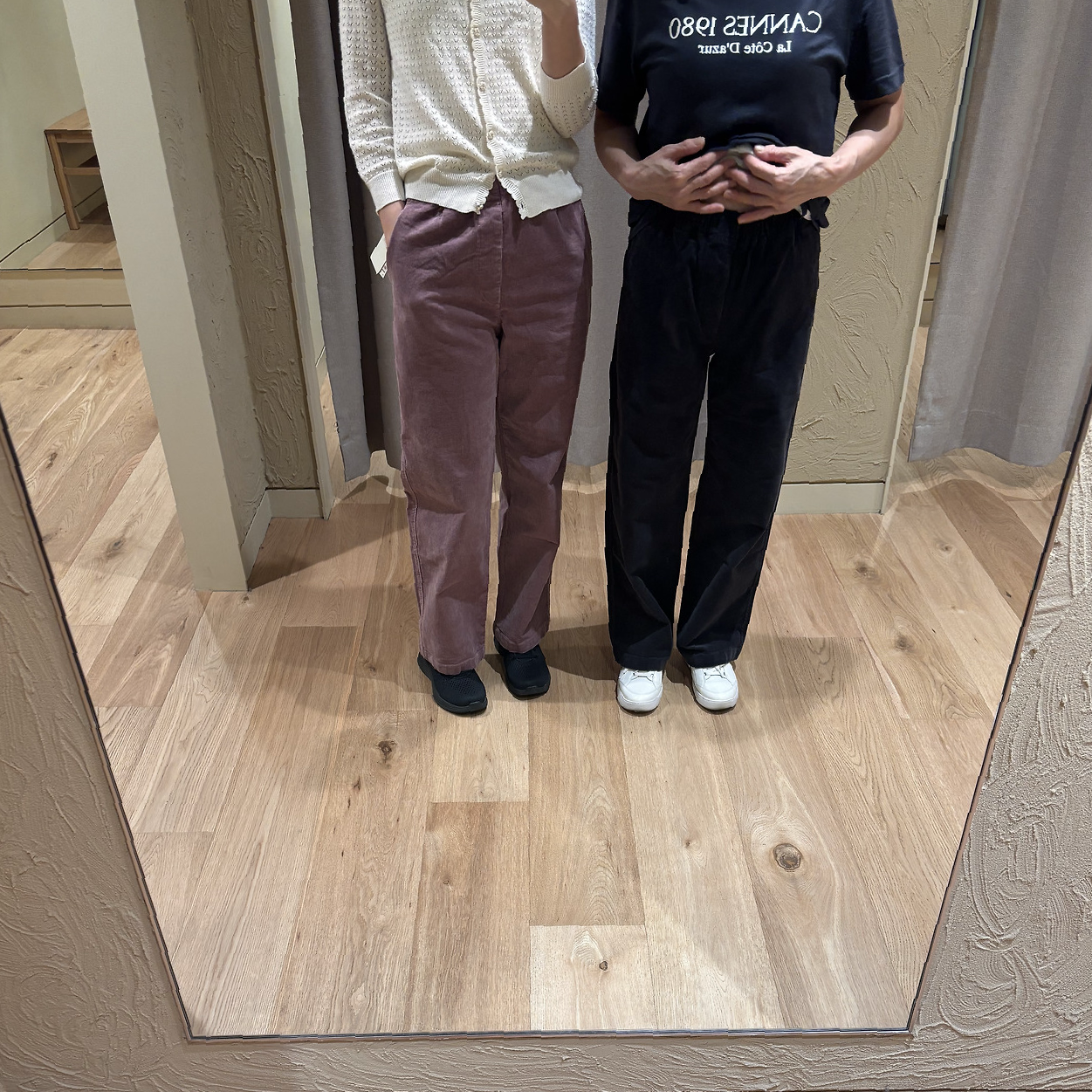 같은 사이즈, 다른 컬러의 바지를 한 장씩 들고 피팅룸에 들어가 입어보고는 무슨 색을 살지 함께 고민하는 우리 모녀.