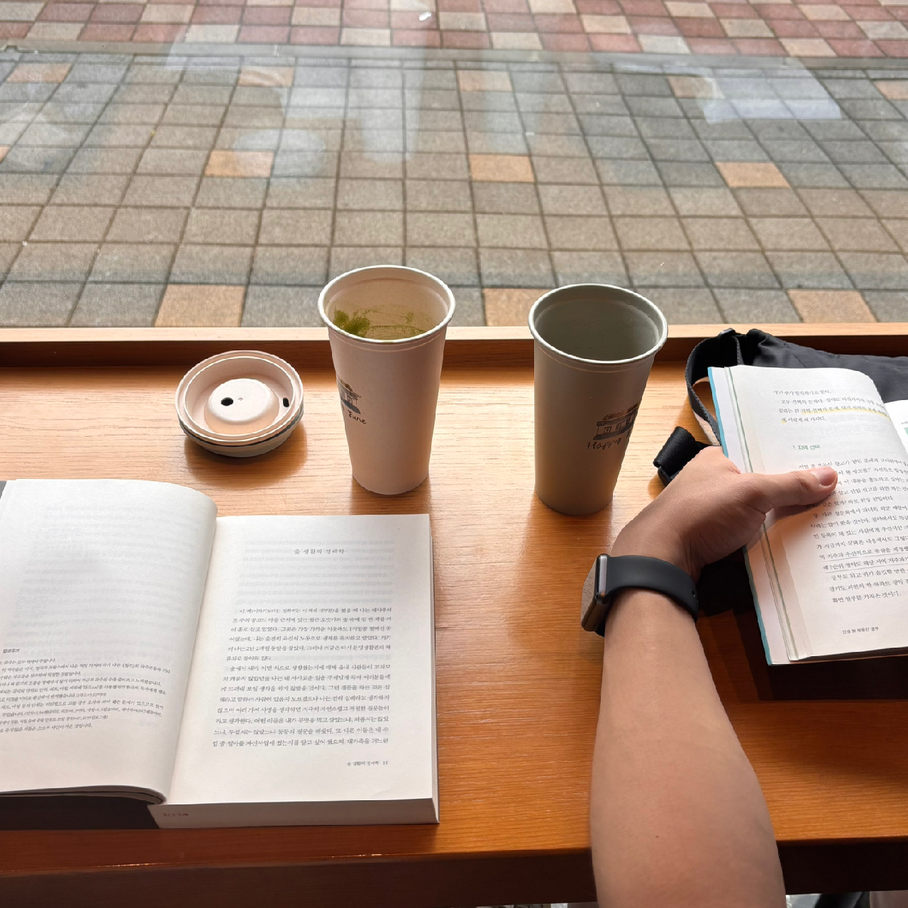 그렇게 8년의 시간이 흘렀는데, 올해가 되어서야 남편이 함께 책을 읽기 시작했다. 주말에 집에서 또는 카페에서 최소 30분씩은 함께 책을 읽는다. 오늘은 카페에 가서 함께 책을 읽었는데, 책으로 알게 된 것을 나에게 설명하며 진지하게 고민하는 모습에 '이 사람이 독서의 맛을 조금은 알게 된 건가?' 싶어 기특하고 뿌듯했다.