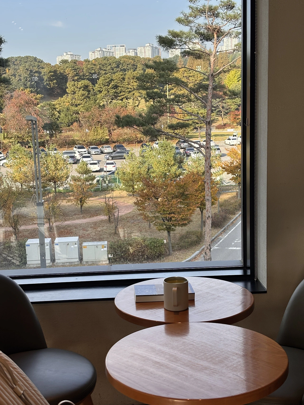 원래는 집에서 800m 정도 떨어진 스타벅스에 갈 생각이었지만, 날씨가 너무 좋아 2km 떨어져 있는 매장까지 가기로 했다. 따뜻한 녹차라떼를 주문해 늘 앉는 3층으로 올라갔는데, 웬걸, 아무도 없었다. 그렇게 나는 갈 때까지 혼자서 그 공간을 온전히 향유했다. 창가에 앉아 큰 통창 너머의 풍경을 한참 바라보다가, 요즘 즐겁게 읽고 있는 책을 꺼내 들었다. 얼마 만에 그렇게 집중해서 책을 읽었는지 모르겠다. 잔잔한 음악, 2층에서 들려오는 대화소리까지도 오히려 집중을 도와줬다.