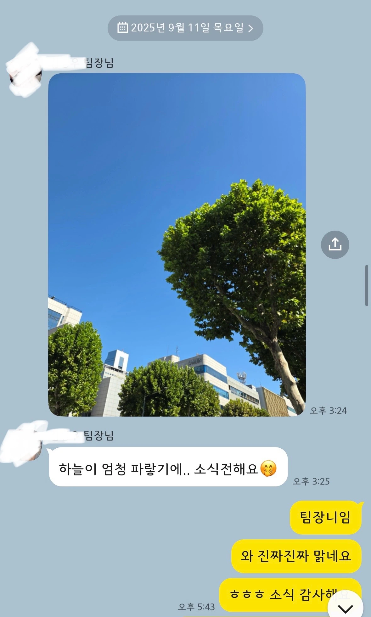 생각해 보니 팀장님께서도 나에게 그런 연락을 해주셨다. 하늘이 높고 푸르렀던 9월 초, 하늘이 엄청 파랗길래 소식을 전하신다며 사진과 함께 카톡을 보내주셨다. 늘 응원하고 있다는 마음을 팀장님만의 담백한 방식으로 조용히 전해오셨던 것이다.