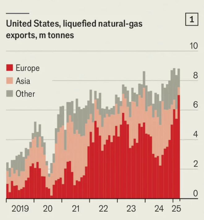 미국의 LNG 수출량 증감, 출처: The Economist
