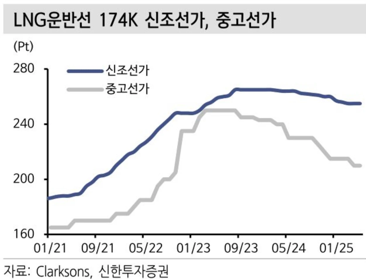 신조선가가 고점을 찍고 하락하고 있다. LNG 운임 또한 매우 떨어져 있는 상태다.