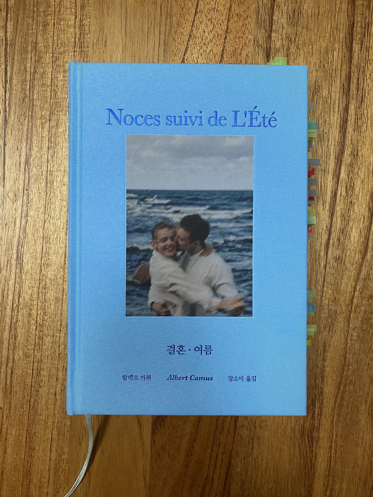 책 표지 중앙에는 바다를 배경으로 한 행복한 연인의 사진이 있다. 한 손을 꼭 맞잡고 다른 한 손은 서로의 몸을 끌어안는다. 여인은 눈을 감고 행복을 느낀다. 사진 주변은 온통 하늘색의 거친 표지가 감싸고 있다. 아직 의도는 알 수 없지만, 오감을 자극하는 꽤나 매혹적인 디자인이다. 푸른 표지의 요철, 행복한 연인, 파도소리, 짜디짠 바다 내음.