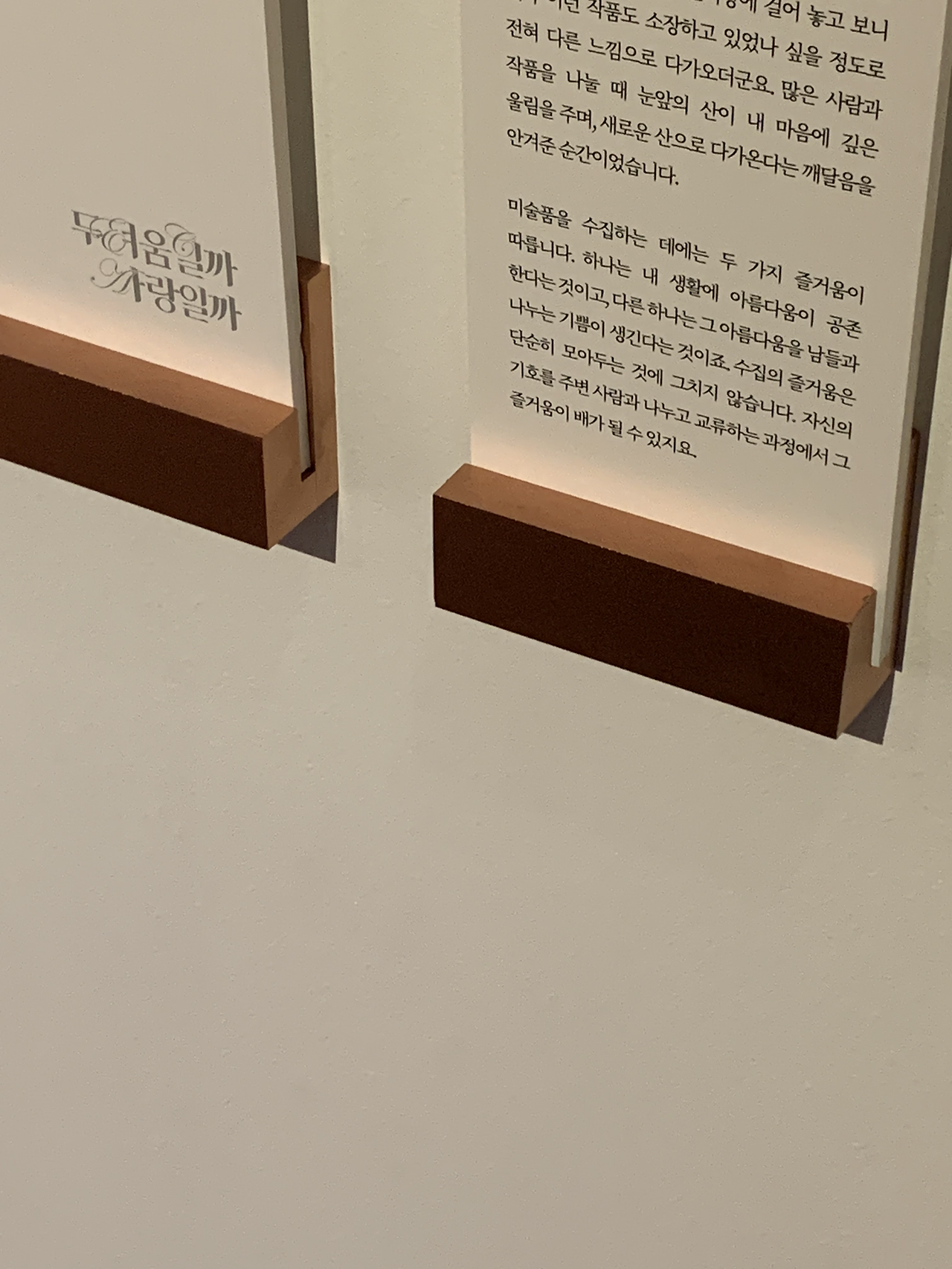 서울미술관 개관 10주년 전시 ‘두려움일까 사랑일까’는 수집가의 여러 작품들을 한데 모아둔 귀한 전시였다. 이중섭의 황소와 그간 이중섭이 일본에서 가족들에게 보냈던 자필 편지를 번역한 영상도 함께 준비되어 있었다. 수집가가 황소를 구입하기 위해 가지고 있던 작품을 팔고, 황소를 구입하고 다시 원래의 작품을 다시 수집하는 과정을 적어둔 수집가의 말이 전시에 생기를 불어넣어 주었다. 김환기의 십만 개의 점, 천경자의 내 슬픈 전설의 49페이지. 한 개인이 이런 대단한 작품을 40년간 모으고 모아 본인의 집에 걸어두고 감상을 했다는 사실도 놀라운데, 그 모든 작품 하나하나를 어떻게 수집했는지, 어떤 마음과 어떤 재정적인 문제를 겪었는지를 소상하게 또 위트 있게 적어두어 재미를 더하였다.