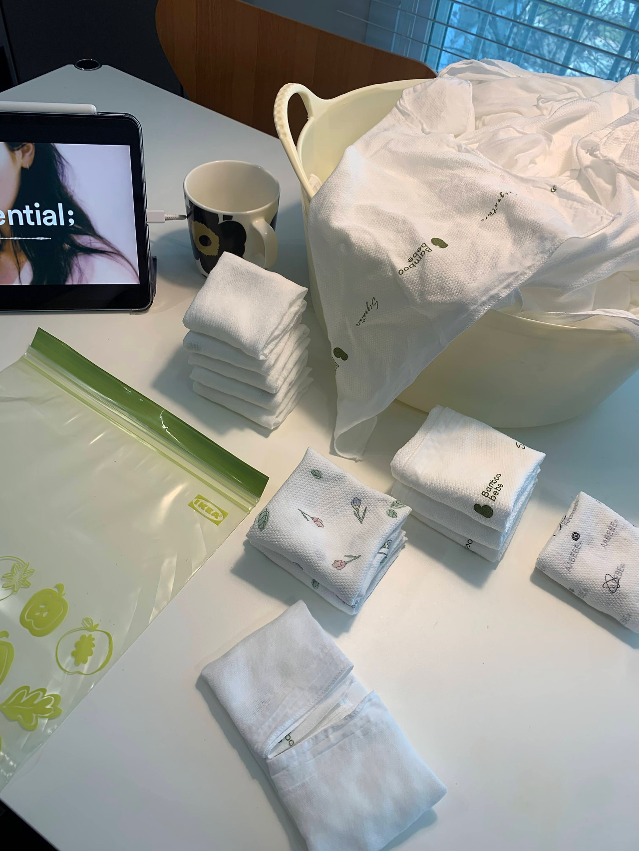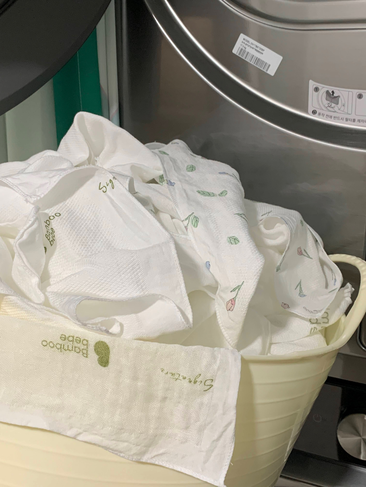 34주 3일, 아기 세탁을 시작했다. 그중에서도 가장 오래 걸린다는 손수건 세탁. 세제 없이, 세제 넣고, 세제 없이 총 3번을 해야 해서 넉넉하게 1.5일의 시간을 잡고 시작했다. 아기용품 중 가장 많이 쓴다는 손수건을 과하게 준비하고 싶지 않아 30장 정도로 준비하고, 옷 선물을 받을 때마다 딸려온 손수건 10장 정도까지 더하니 총 40장 정도가 되었다. 육아용품 후기들을 찾아보다가 많게는 80장까지 준비했다는 후기를 보고 멈칫했다. 정말 그 정도가 필요한 건가. 세탁하다가 진 다 빠지겠는데 싶기도 하고.