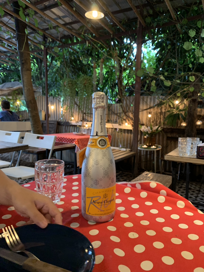 빨간 땡땡이 식탁보가 멋진 곳에서 조금 일찍 결혼기념일 축하 저녁을 먹었다. 콜키지 프리라는 정보를 조금 일찍 알아내 어제 비행기 타기 전 면세점에서 멋진 샴페인도 한 병 사논 참이었다.