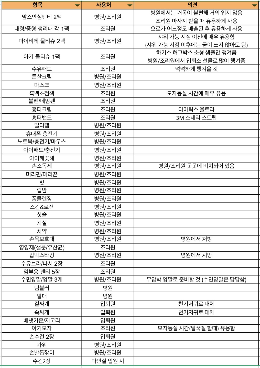 *출산가방 리스트 (34주 후반부터 준비 시작)
