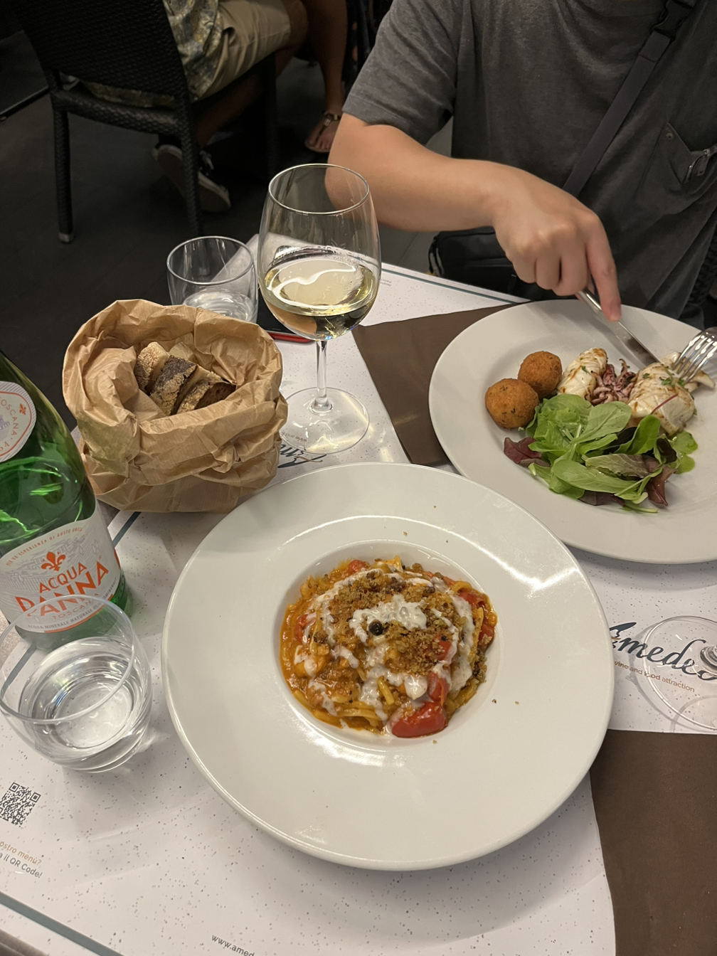 호텔 근처 테라스가 딸린 식당에 앉아 첫날밤 첫 저녁을 먹었다. 세계 곳곳에서 날아온 설렌 표정의 여행객들과 어우러져 와인 한 잔, 파스타 한 그릇을 먹고 나니 이탈리아는 어느새 야심한 밤, 한국에서는 아기의 하루가 다시 시작되고 있었다.