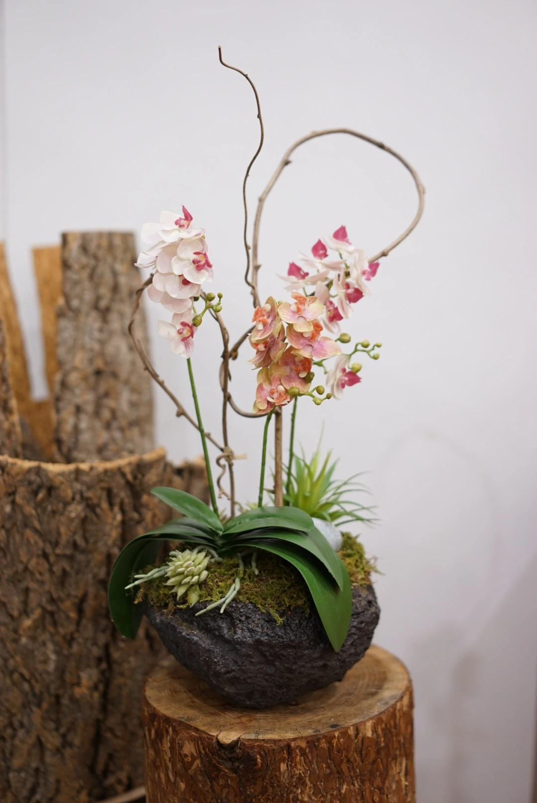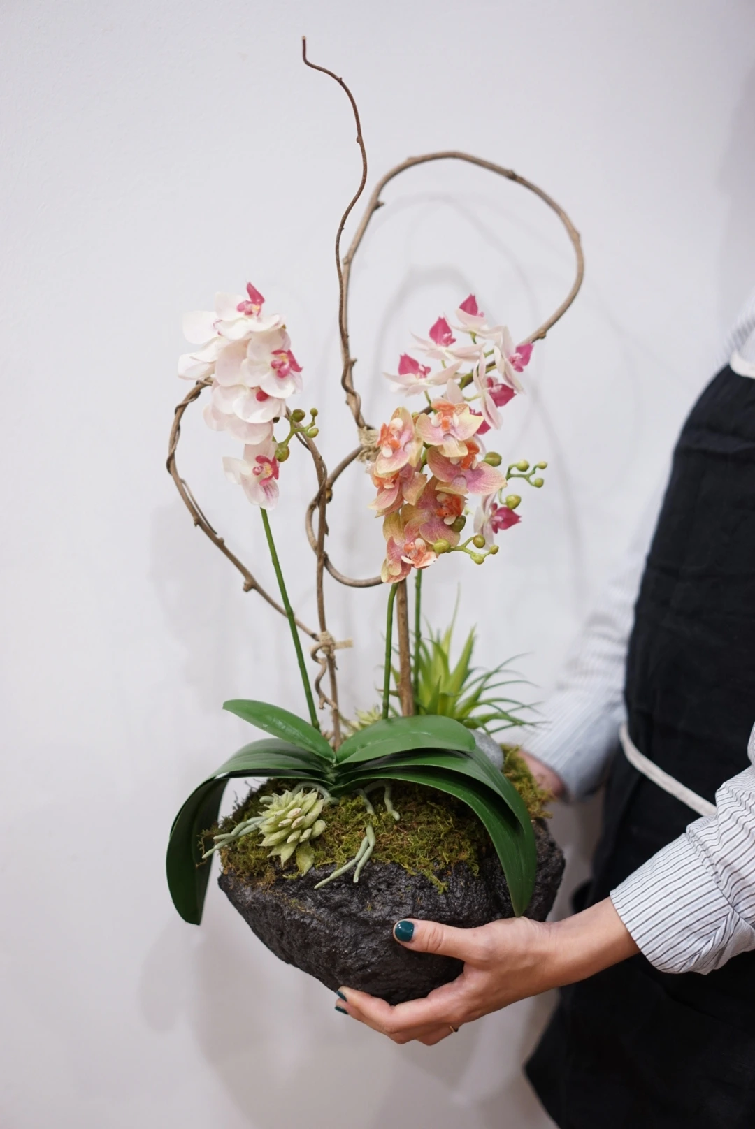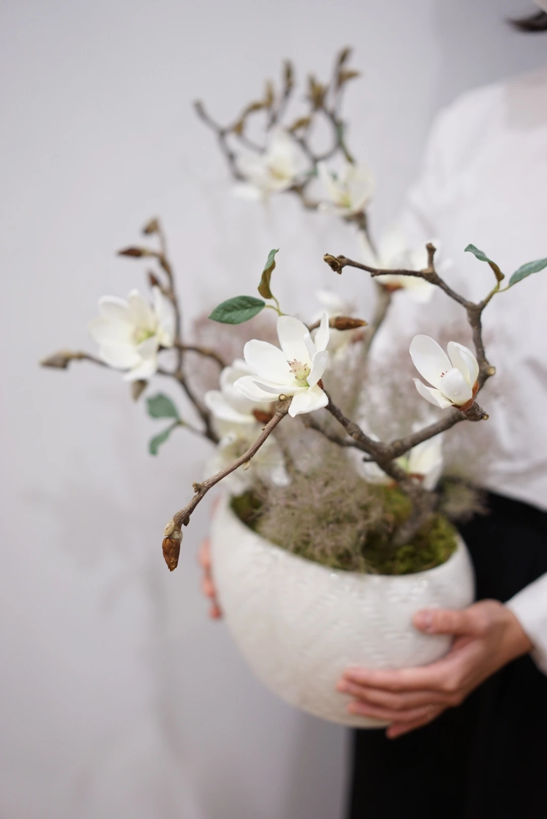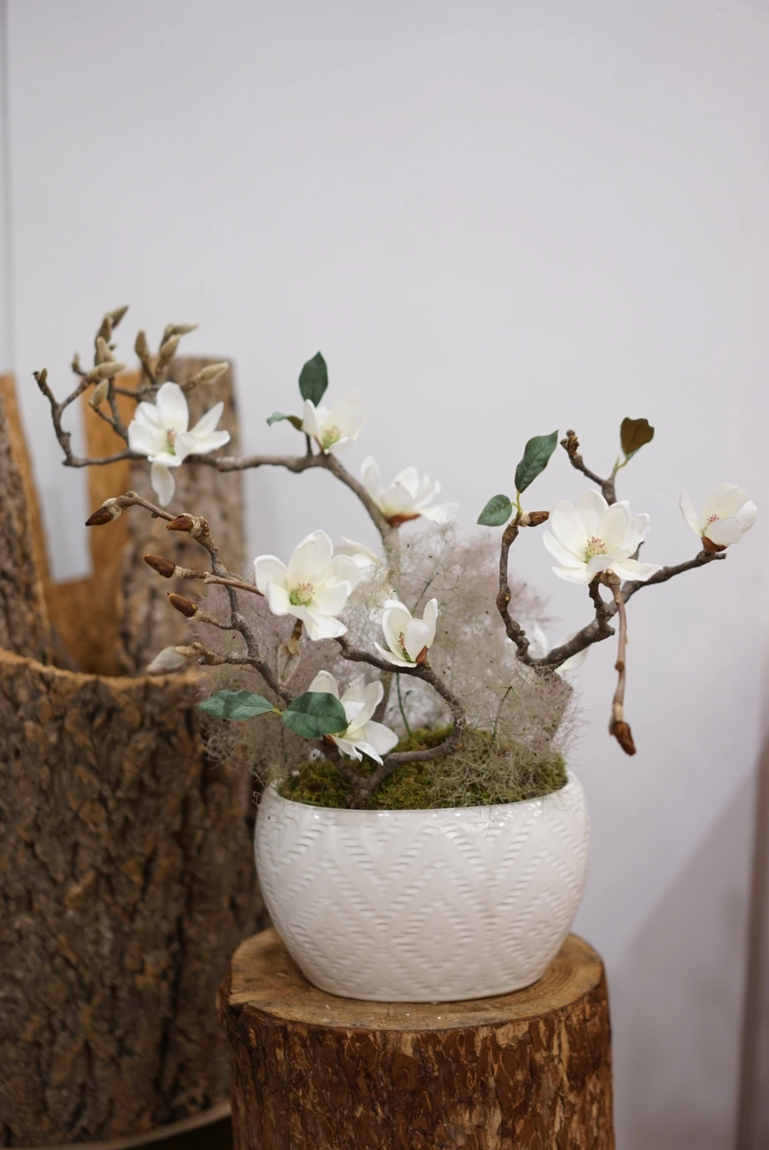 그리고 마지막으로 바싹 말려진 목련 가지에 한 여름 목련을 틔웠다. 집 앞 목련 나무를 생각하며 희고 뽀얀 목련 꽃을 얹어 만든 작품. 거기에 잘 마른 스모크 트리가 이끼와 어우러져 멋진 화분을 만들었다.