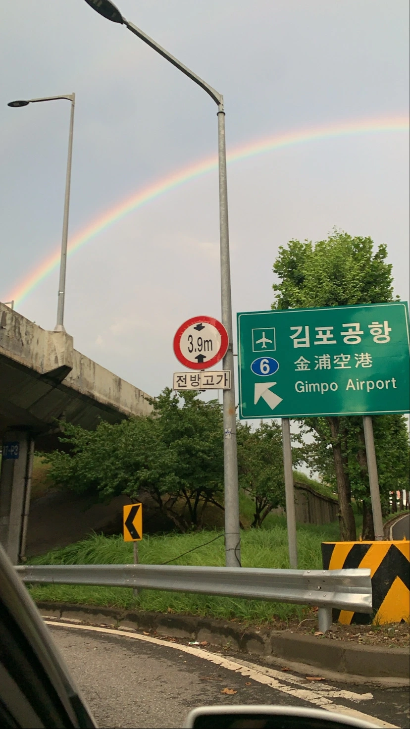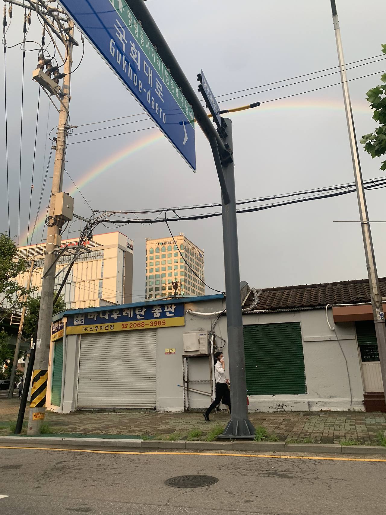 이른 퇴근을 하고 점심에 사뒀던 샐러드를 오손도손 나눠먹자마자 바로 차를 몰고 길을 나섰다. 지난 주말 사이에 하늘이 온통 분홍빛으로 물들었다던데 오늘의 노을은 어떨까 엄청나게 기대하면서. 안타깝게도 구름이 잔뜩 끼어 분홍빛 하늘은 보지도 못했다. 그 대신 아주 크고 선명한 무지개를 봤다. 쉼 없이 내리는 소낙비와 햇볕 사이에 서울의 끝과 끝을 이을 법한 큰 무지개가 떠있었다. 정말 여름 같았던 하늘.