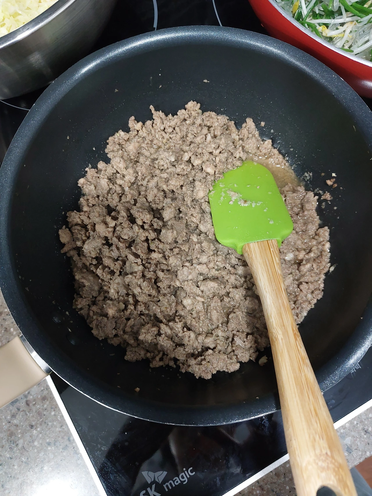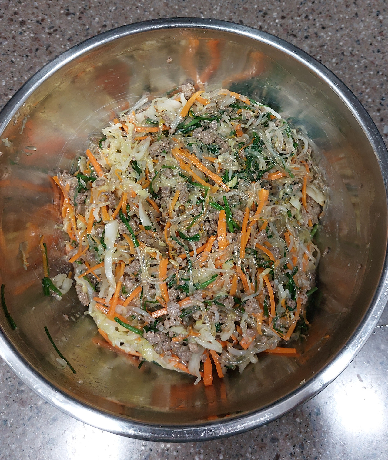 고기와 야채, 당면 모두 바로 모두 먹을 수 있을 정도로 잘 익힌다. 잡채같기도.