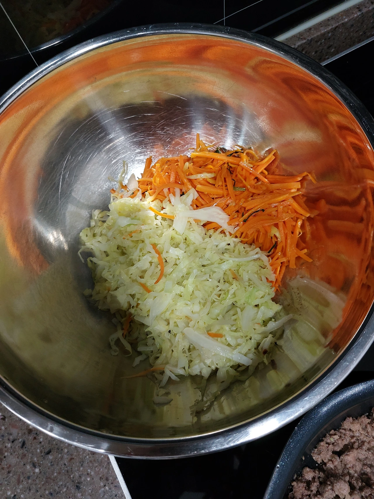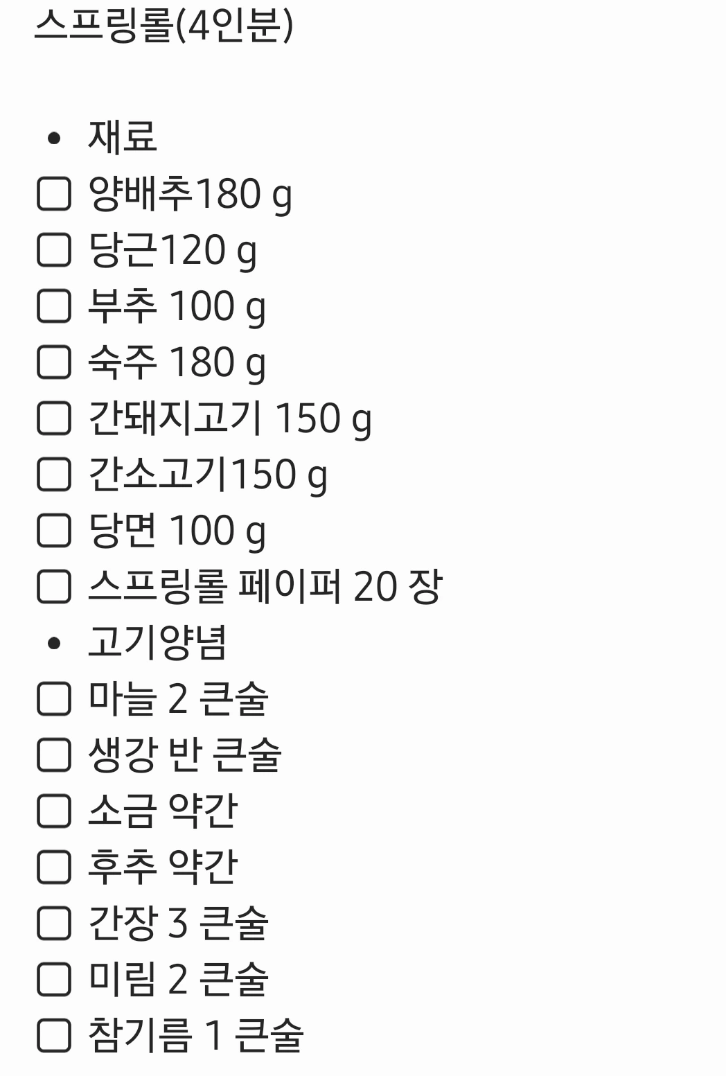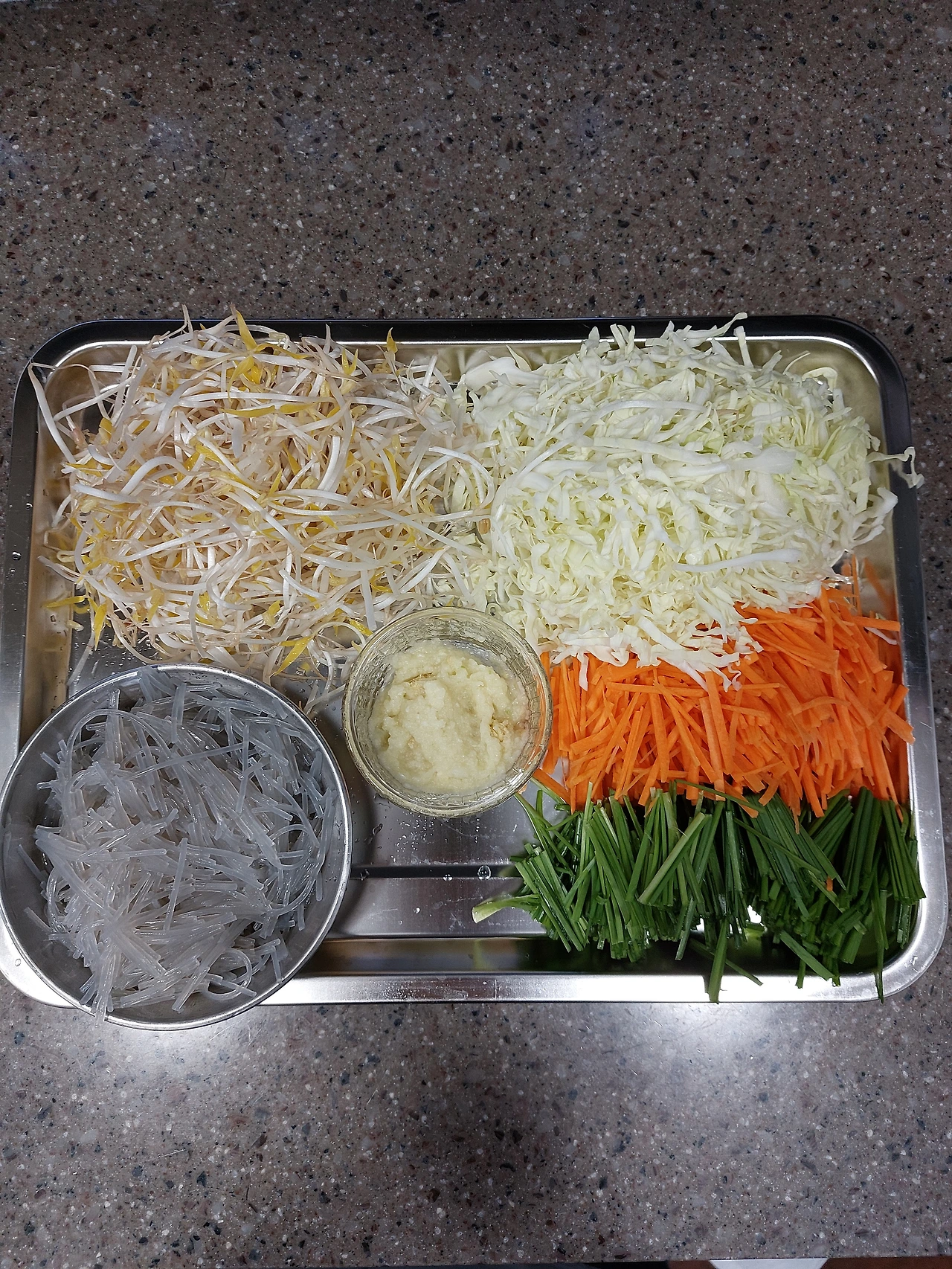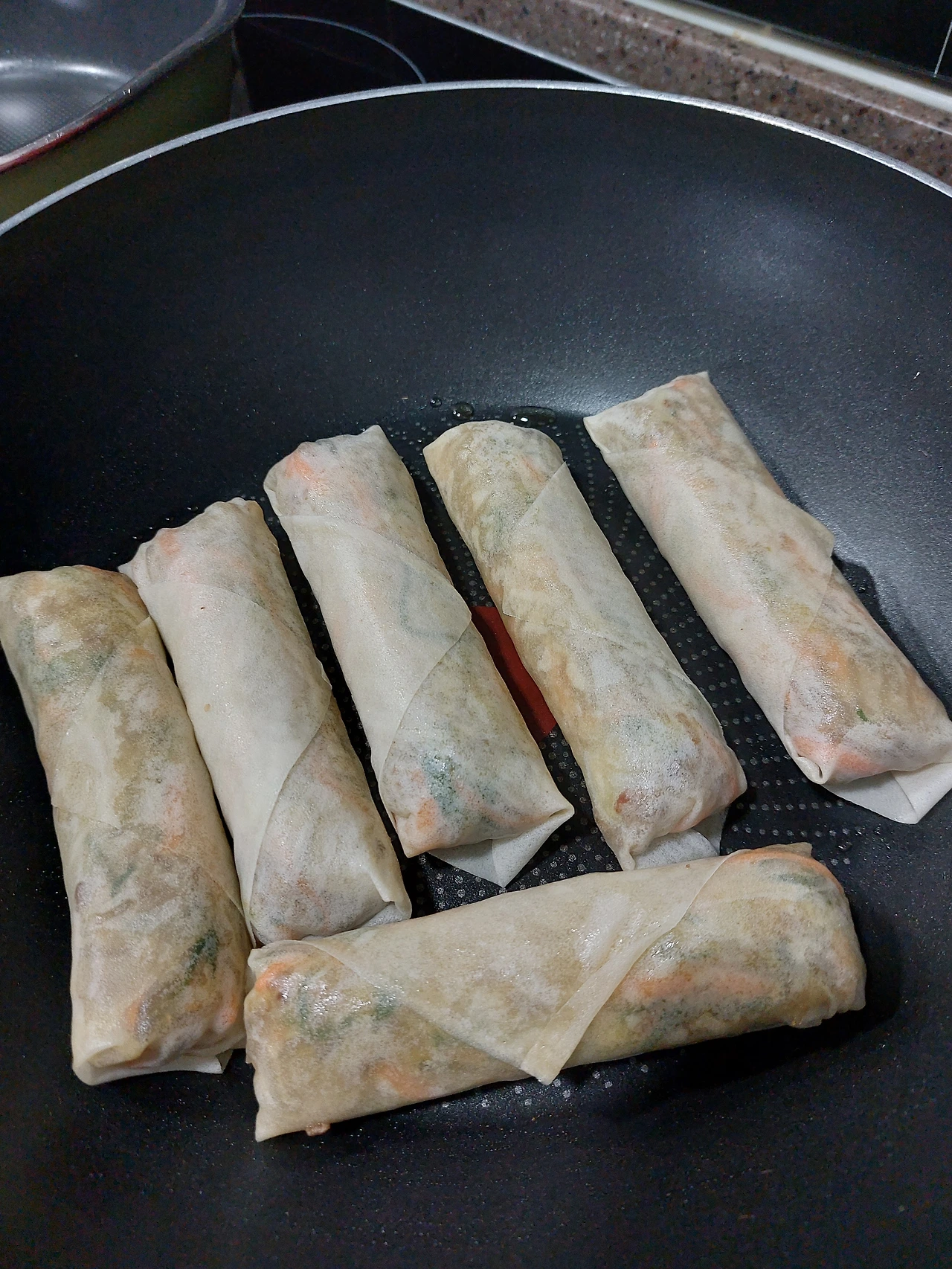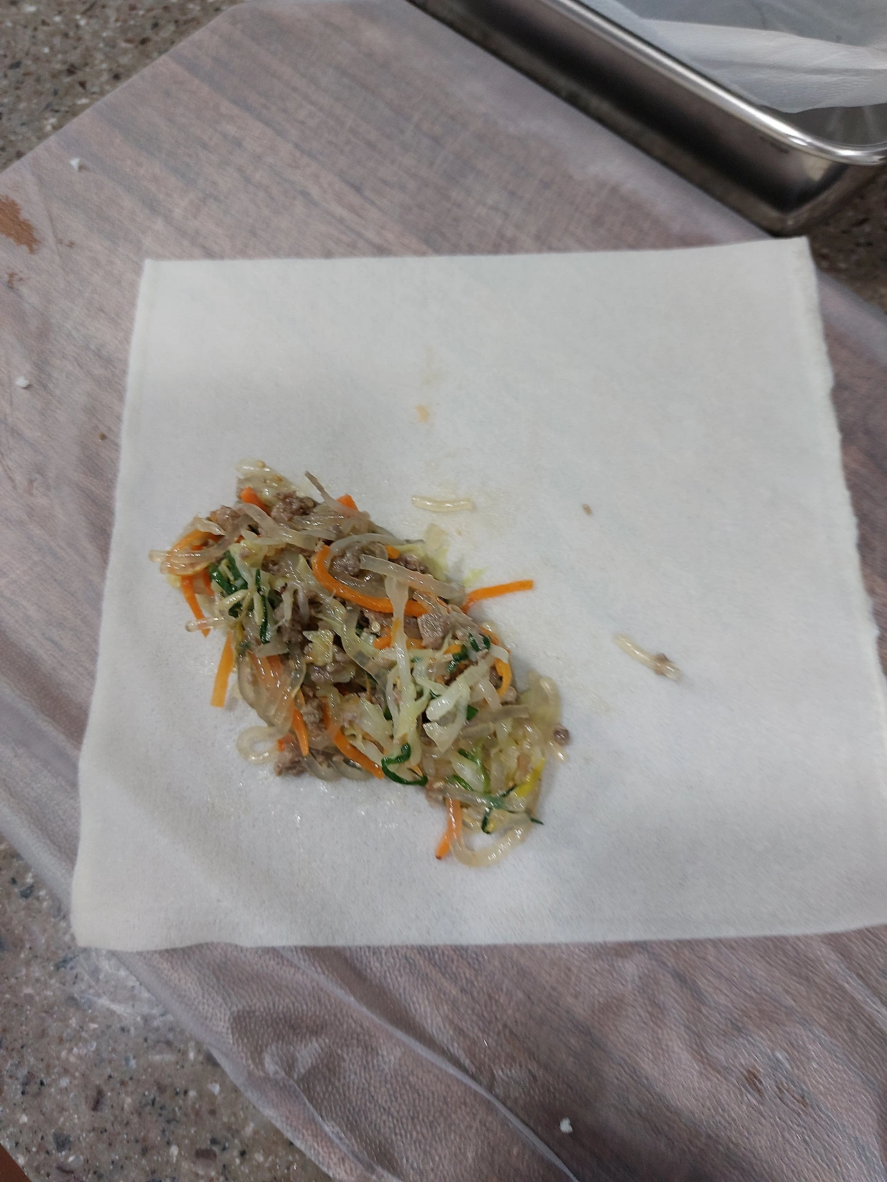 • 요리 순서 1. 야채들을 깨끗하게(양배추는 한 장씩 떼어 사이사이) 씻어 물기를 빼준다. 2. 분량의 당면을 60도 이상 뜨거운 물에 불려준다. 3. 물기가 빠진 야채들을 손가락 두 마디 정도 크기로 자른 뒤, 채 썰어준다. 5. 마늘과 생강을 믹서에 넣고 곱게 간다. 4. 간 돼지고기와 소고기를 용기에 담은 뒤 양념을 넣고 잘 섞어준다. 5. 궁중팬에 기름을 두르고 당근, 양배추를 따로 볶은 뒤(소금 간 살짝) 볼에 담아둔다. 6. 작은 팬에 양념된 고기를 센 불에서 볶다가 고기에서 육즙이 나오기 시작하면 중불로 줄인다. 7. 6에 숙주, 부추, 불린 당면을 넣고 볶다가 불을 끄고 볶아 둔 당근, 양배추를 넣고 잘 섞어준다. 부족한 간은 소금으로 맞춘다. 8. 7을 큰 볼에 옮겨 담고, 한 김 식힌다. 9. 스프링롤 페이퍼에 적당한 양(한 주먹 정도)의 볶음 소를 올려놓고 김밥 말듯 돌돌 말다 양쪽 끝을 안으로 접어서 끝까지 말아준다. 10. 프라이팬에 기름을 살짝 두르고 약불에서 완성된 스프링롤을 앞뒤로 살살 굴려가며 겉을 익혀준다. 11. 피시소스나 핫소스, 흑임자 깨소스 등에 찍어서 맛있게 먹는다.