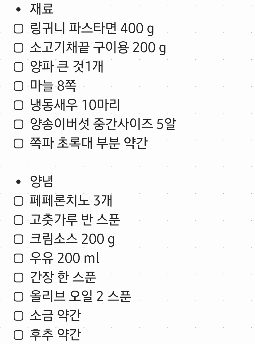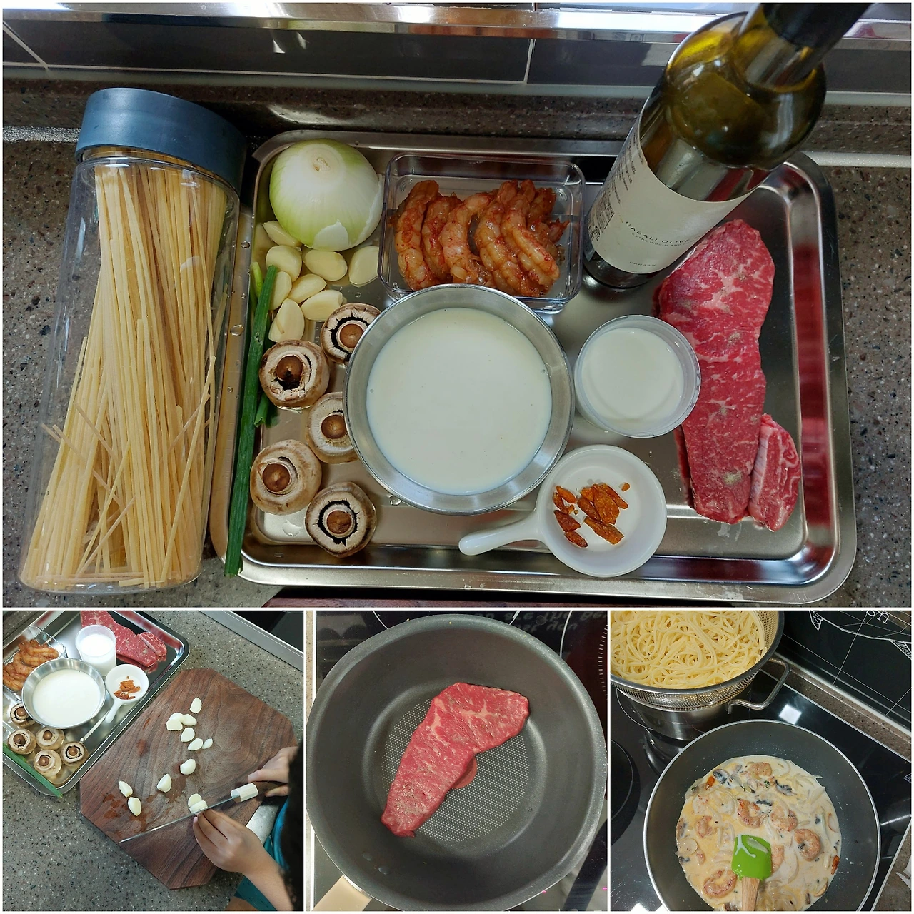 • 조리순서 1. 냉동새우를 냉장고에서 해동시킨 후, 흐르는 물에 씻어 물기를 제거한 뒤, 고춧가루, 간장으로 밑간을 한다. 2. 소고기를 키친타월로 꾹꾹 눌러 핏물을 닦아낸 후, 소금, 후추 간을 한다. 3. 밑재료(양파, 마늘, 양송이버섯, 쪽파)를 깨끗이 씻어 소쿠리에 담아 물기를 제거한다. 4. 냄비에(속이 깊은) 끓는 물에 소금 한 꼬집, 올리브 오일을 넣고 링귀니 파스타면을 넣고 8~10 분 삶는다. 5. 면을 삶는 동안 마늘을 납작하게 어슷 썰어주고, 양송이버섯과 양파는 얇게 채 썬다. 6. 중불로 달궈진 프라이팬에 소고기를 올리고 앞 뒤로 한 번 씩 구워 준 뒤 한 입 크기로 잘라 잘 익혀준다. 7. 다 삶아진 면은 면수 한 국자를 따로 빼두고 채에 바쳐둔다. 8. 예열된 궁중팬에 올리브 오일을 두르고 편 마늘을 넣고 볶다가 마늘향이 올라오면 페퍼론치니와 양파와 양송이버섯을 넣고 볶아준다. 9. 8에 양념된 새우를 넣고 볶다 반쯤 익으면 우유와 크림소스*를 넣는다. 10. 소스가 끓어오르면 면을 넣고 섞어 준다. 소스에 면수를 조금 추가하여 저어주다 마지막에 잘라놓은 스테이크를 넣어 소스가잘 스며들게 섞어준 뒤 불을 끈다. 11. 파스타 볼에 면을 잘 말아 담은 뒤, 파슬리나 바질 고명을 올려 인증샷을 찍고 맛있게 먹는다.